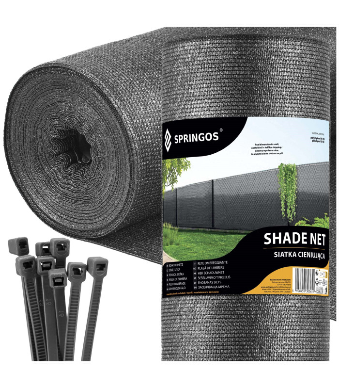 Zīmols: Springos® Krāsa: gaiši antracīta Materiāls: polietilēns PE HD Savilcēju materiāls: neilons Svars: 185 g/m² Noēnojuma pakāpe: 95% Izmēri: Tīkla izmērs: 1.5 x 10 m Ruļļa izmērs: 77 x 24 cm Papildus informācija: 200 x savilcēji – 3.6 x 150 mm (melni) Produkts paredzēts lietošanai mājsaimniecībā