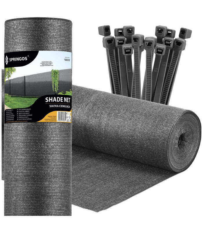 Zīmols: Springos® Krāsa: gaiši antracīta Materiāls: polietilēns PE HD Savilcēju materiāls: neilons Svars: 65 g/m² Noēnojuma pakāpe: 62% Izmēri: Tīkla izmērs: 1.5 x 25 m Ruļļa augstums: 82 cm Papildus informācija: 100 x savilcēji – 3.6 x 150 mm (melni) Produkts paredzēts lietošanai mājsaimniecībā Piegādei tīkls ir salocīts uz pusēm