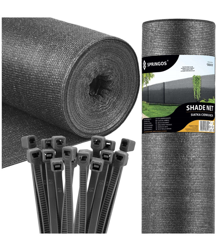 Zīmols: Springos® Krāsa: gaiši antracīta Materiāls: polietilēns PE HD Savilcēju materiāls: neilons Svars: 65 g/m² Noēnojuma līmenis: 62% Izmēri: Tīkla izmērs: 1.5 x 50 m Ruļļa augstums: 82 cm Papildus informācija: 100 x savilcēji – 3.6 x 150 mm (melni) Produkts paredzēts lietošanai mājsaimniecībā Tīkls tiek piegādāts salocīts uz pusēm