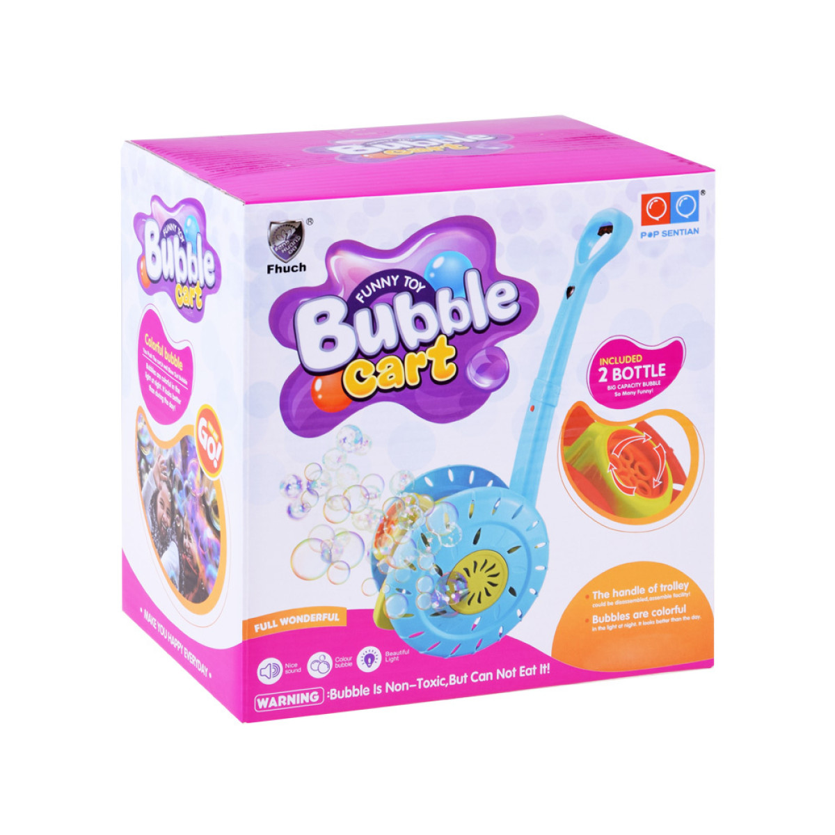 Ziepju burbuļi ir iemīļota rotaļa gan maziem, gan lieliem bērniem. Brīnišķīgs ziepju burbuļu automāts ar pushera, vārpstas formu noteikti sagādās daudz prieka katram bērnam. Rotaļlieta ļauj izpūst krāsainus burbuļus automātiski. Vienkārši pieskrūvējiet pudelīti ar šķidrumu pie vārpstas apakšējās daļas, ieslēdziet pogu, kas atrodas uz pushers roktura, lai iedarbinātu ventilatoru un diska rotāciju, kas, griežoties, izpūš burvīgus, varavīksnes burbuļus. Bet tas vēl nav viss - rotaļas laikā skan jautra melodija un mirgo krāsainas gaismiņas.