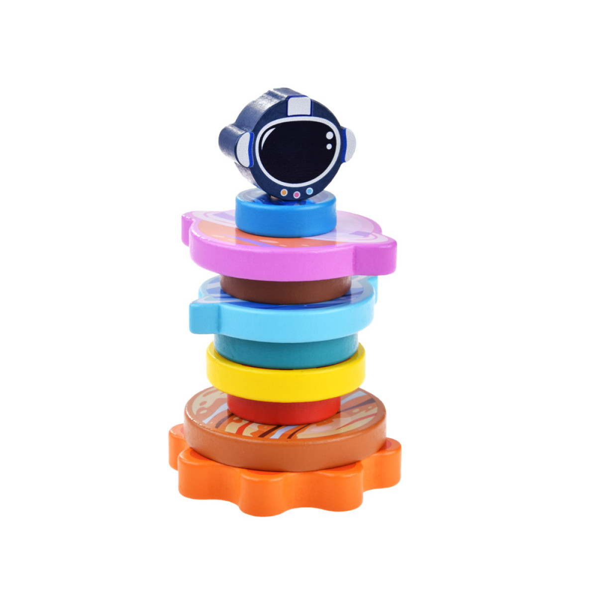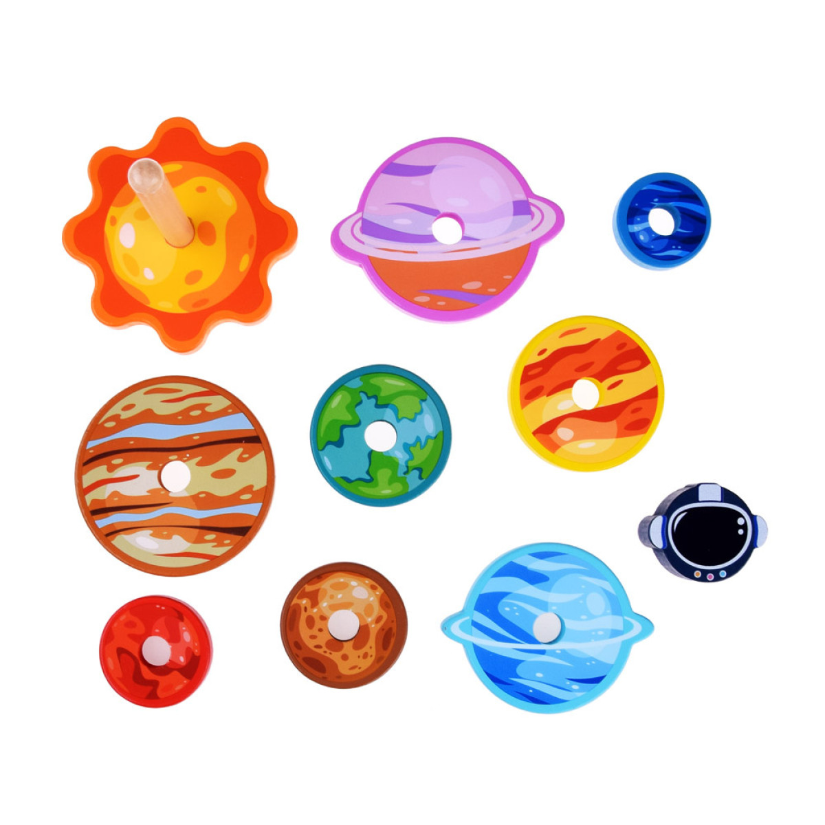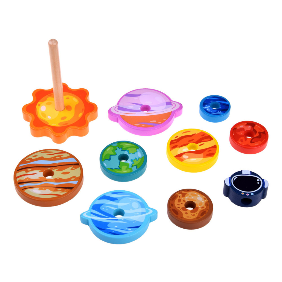 Edukācijas koka piramīda ir ideāla rotaļlieta bērna manuālo prasmju attīstīšanai. Bērna uzdevums ir sakārtot riņķus uz pamatnes no lielākā uz mazāko. Piramīdas noslēgums ir ķivere kosmonauta formā. Kosmiskā stilistika: riņķi ir Saules sistēmas planētas, un pamatne ir Saule. Spēles laikā bērns attīsta koncentrāciju, acu-roku koordināciju un smalko motoriku. Papildus tiek attīstīta telpiskā iztēle, mācīšanās atšķirību meklēšanai un datu salīdzināšanai. Krāsainais komplekts un interesantā grafika rada bērnā interesi par rotaļlietu. Komplektā noteikti būs daudz stundu brīnišķīgas izklaides.