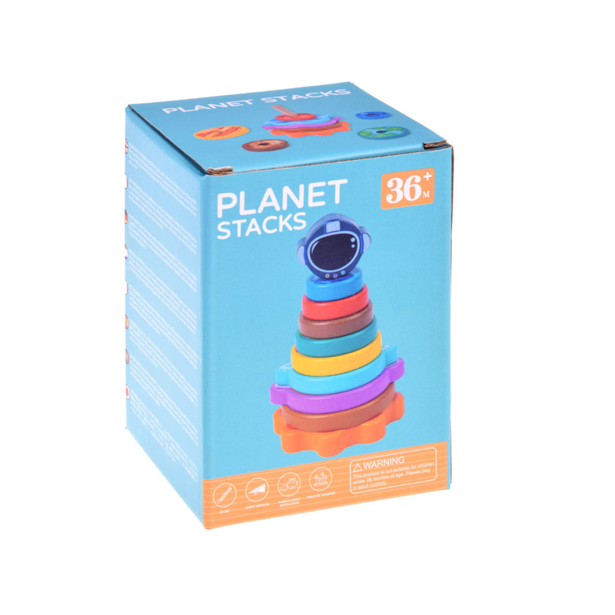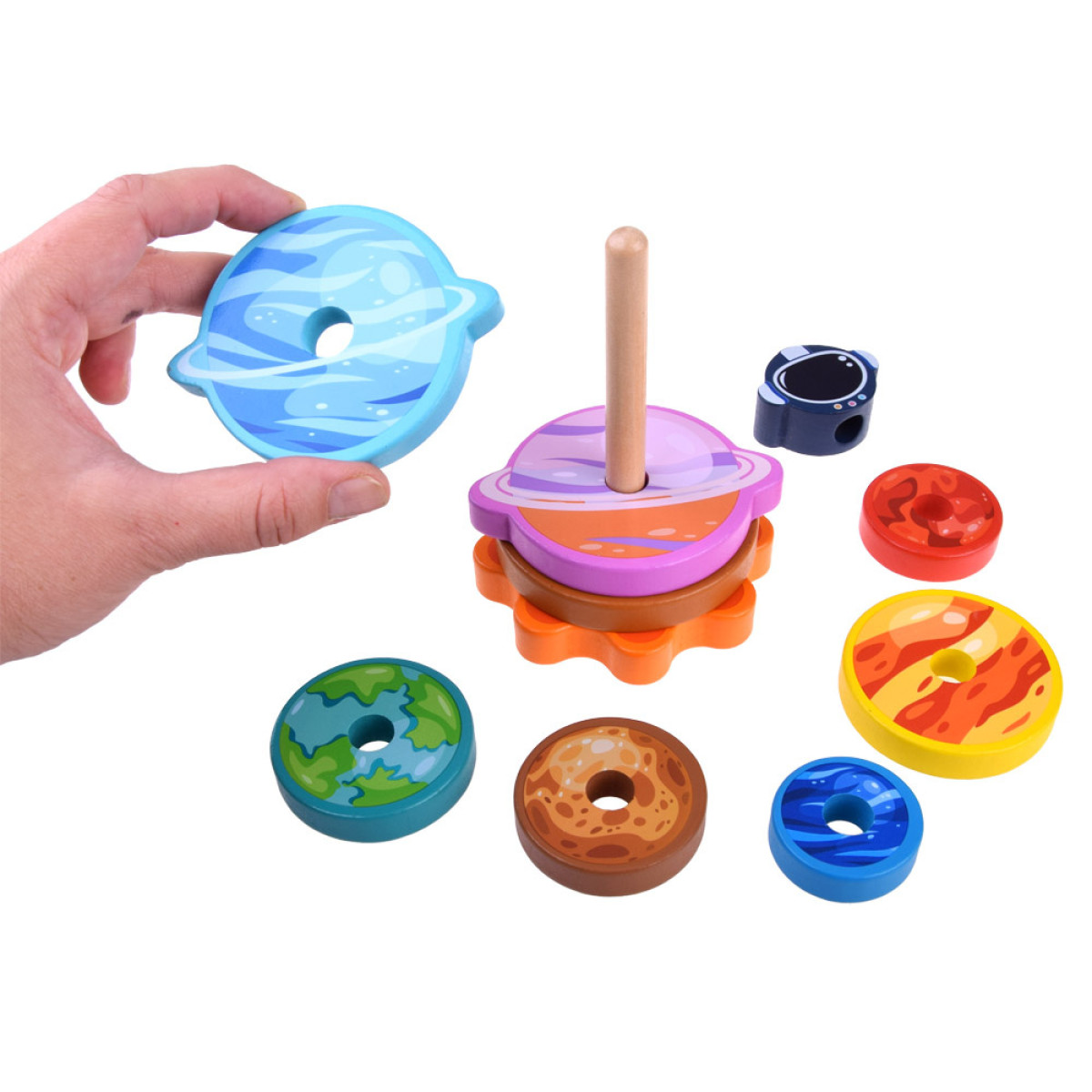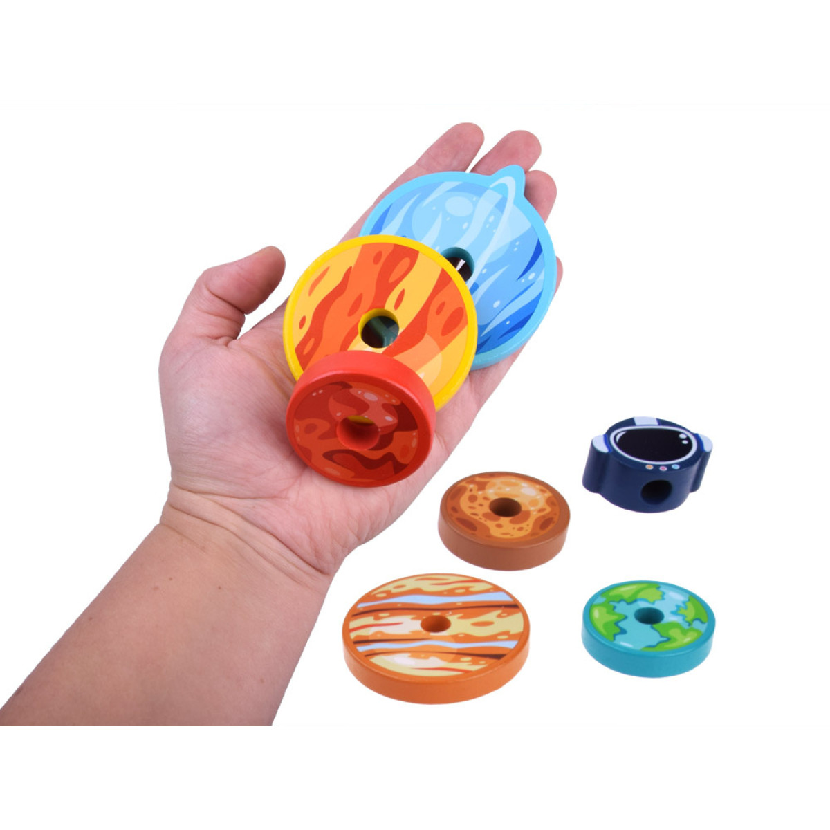 Edukācijas koka piramīda ir ideāla rotaļlieta bērna manuālo prasmju attīstīšanai. Bērna uzdevums ir sakārtot riņķus uz pamatnes no lielākā uz mazāko. Piramīdas noslēgums ir ķivere kosmonauta formā. Kosmiskā stilistika: riņķi ir Saules sistēmas planētas, un pamatne ir Saule. Spēles laikā bērns attīsta koncentrāciju, acu-roku koordināciju un smalko motoriku. Papildus tiek attīstīta telpiskā iztēle, mācīšanās atšķirību meklēšanai un datu salīdzināšanai. Krāsainais komplekts un interesantā grafika rada bērnā interesi par rotaļlietu. Komplektā noteikti būs daudz stundu brīnišķīgas izklaides.