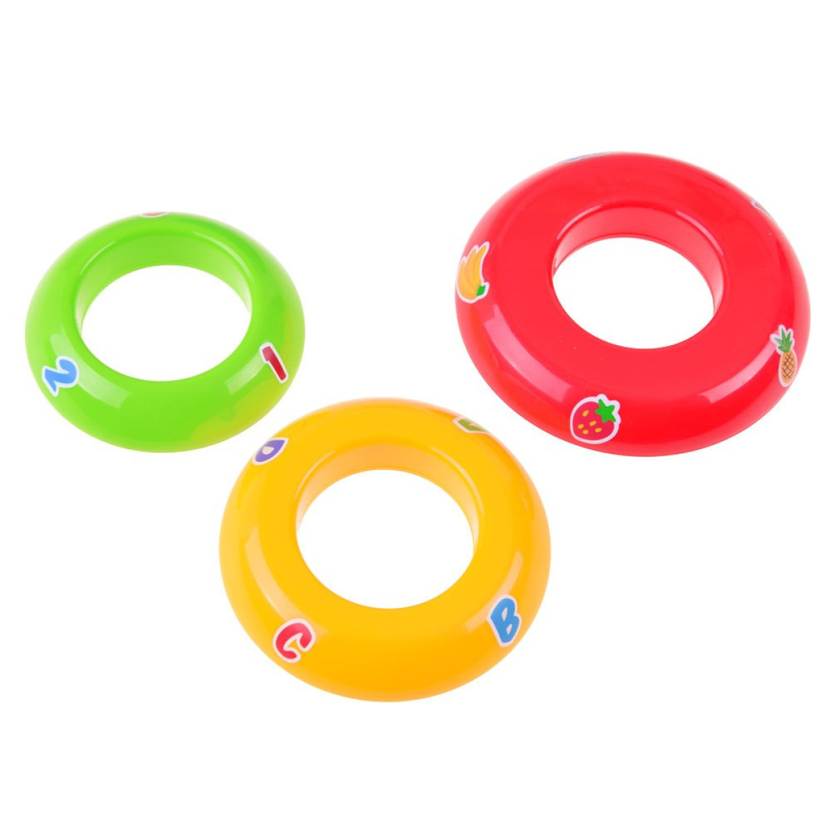 - 9+ mēneši: krāsainu gredzenu kārtošana pēc izmēra palīdz mazulim attīstīt roku veiklību, loģisko domāšanu un krāsu atšķiršanu.