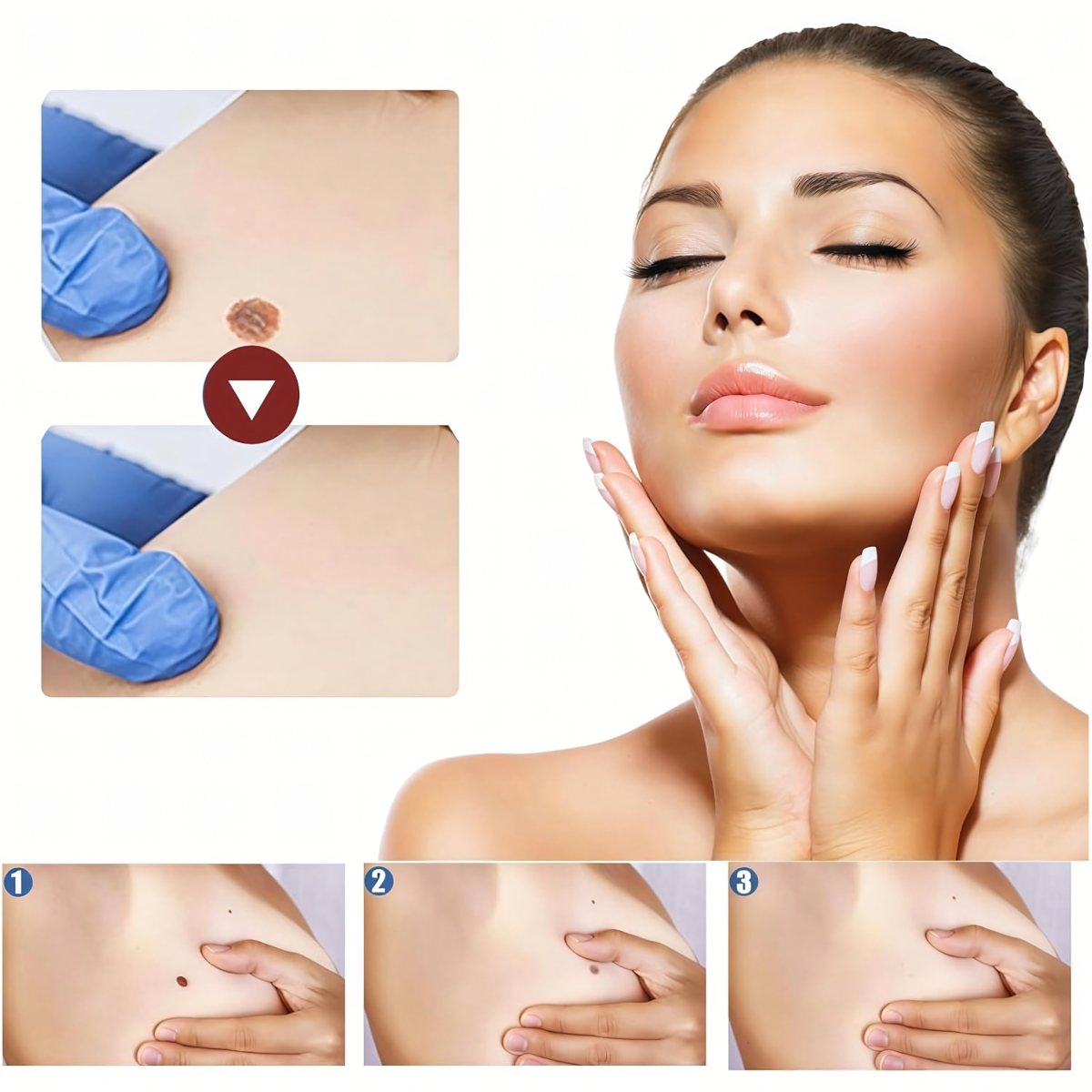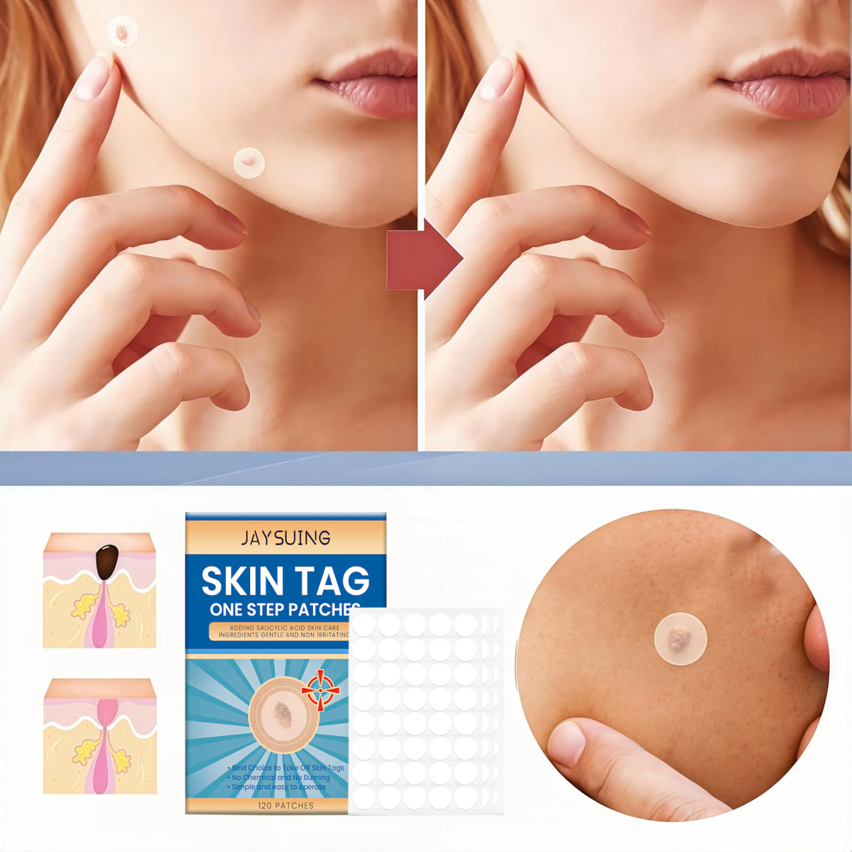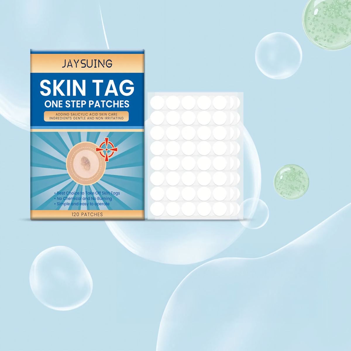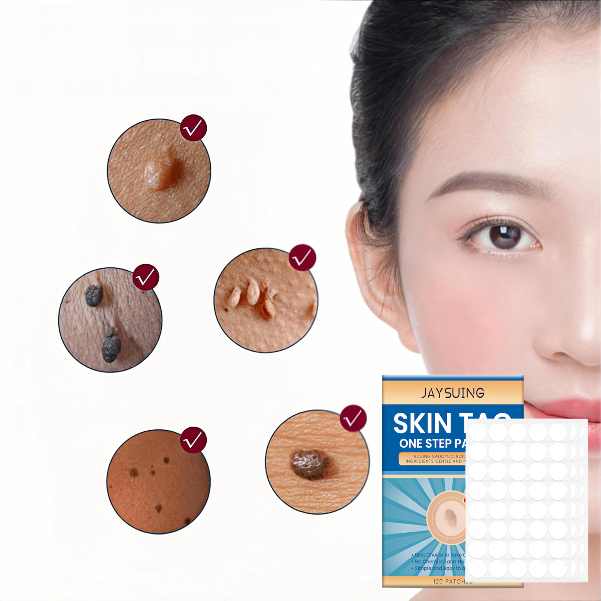 Komplekts ar 120 plāksteriem ādas kopšanai satur tokoferolu (vitamīnu E), salicilskābi un tējas koka eļļu. Šie komponenti atbalsta ādas reģenerāciju ap ādas izaugumiem, palīdz mazināt kairinājumu un veicina to dabisko noņemšanas procesu.