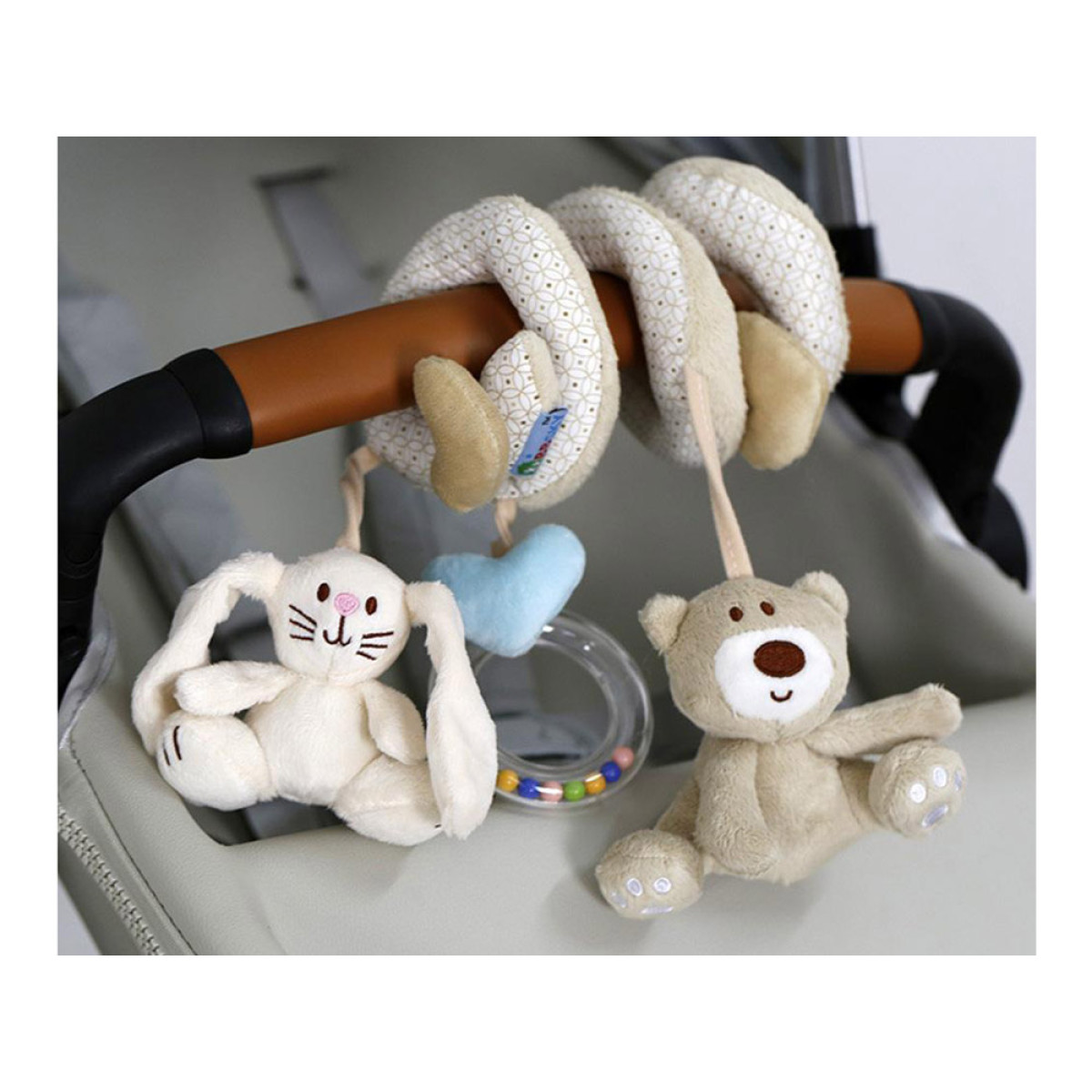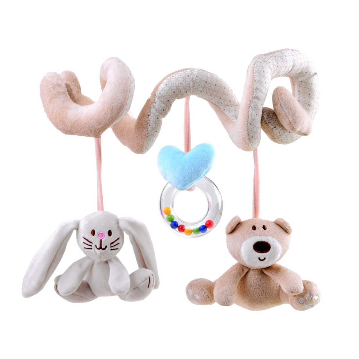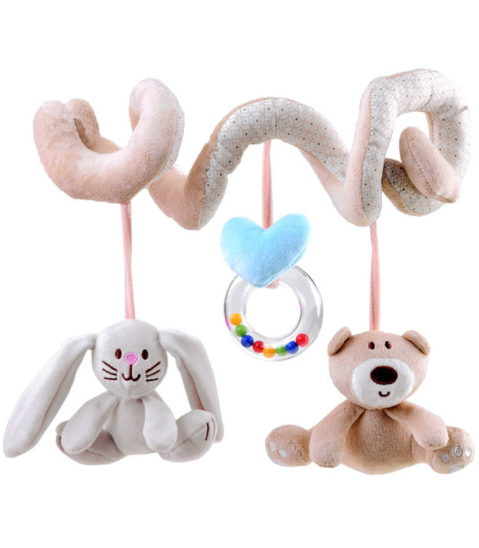 Plīša spirāle ratiņiem ar rotaļlietām ir daudzfunkcionāla, izglītojoša rotaļlieta, kas paredzēta pašiem mazākajiem. Produkts apvieno vairākas funkcijas un rūpējas par bērna pareizu attīstību no pirmajām dzīves dienām. Tas lieliski iekļaujas mūsdienīgā bērnu istabu interjerā. Spirāli var viegli piestiprināt pie ratiņiem, virs gultiņas, sēdeklīša, kulbiņas vai automašīnas sēdekļa, lai tā pavadītu bērnu visu dienu - gan mājās, gan ceļojuma laikā. Priekšrocības: spirāles forma nodrošina bērnam lielisku izklaidi, un pārdomātā konstrukcija novērš rotaļlietu atdalīšanos un pazaudēšanu. Spirālei ir pievienotas trīs piekaramās rotaļlietas: mīļais lācītis, zaķis un aplis ar krāsainām pērlītēm. Produkts ļauj bērnam iepazīt pasauli ar redzes un taustes sajūtām, sniedzot unikālus sensoriskos iespaidus.