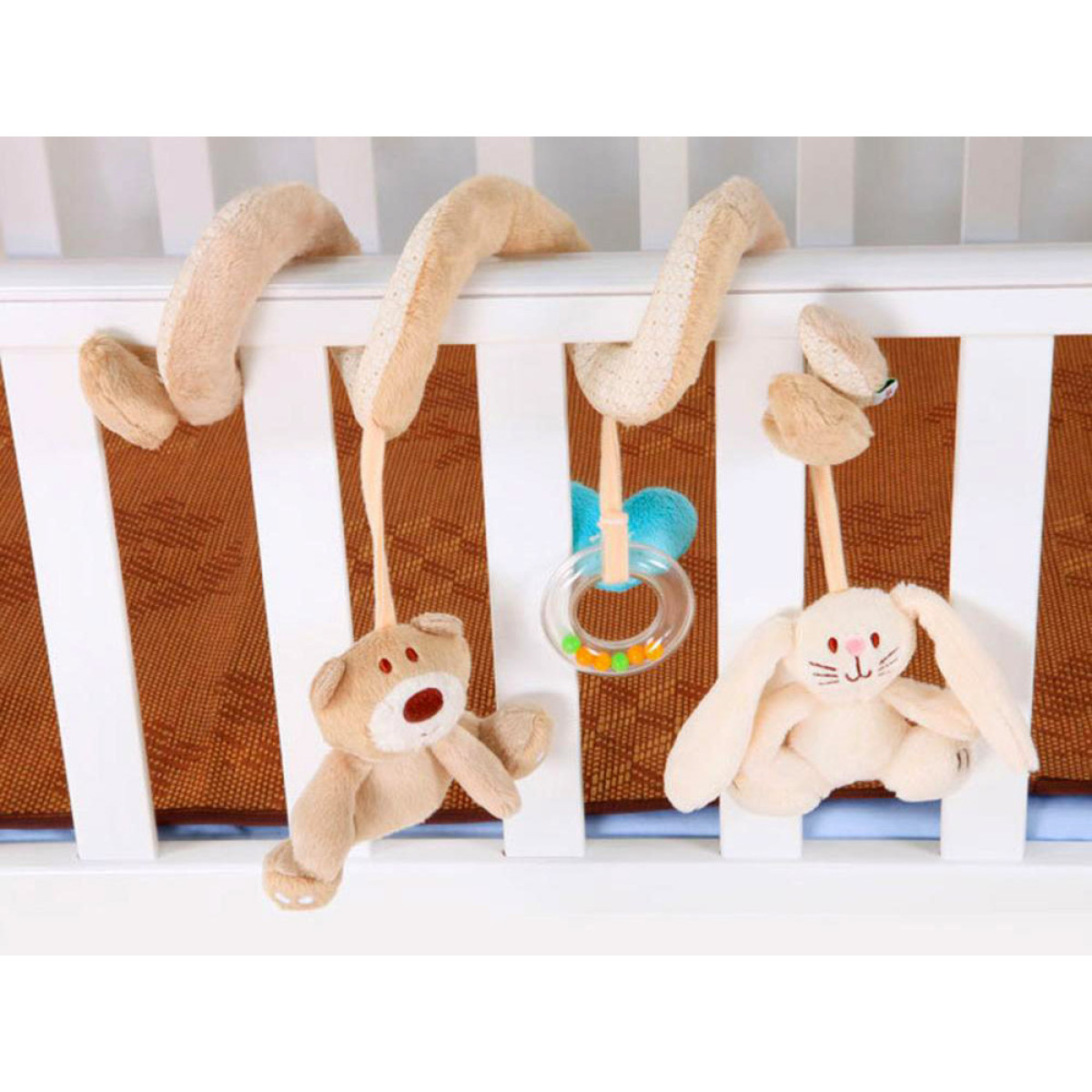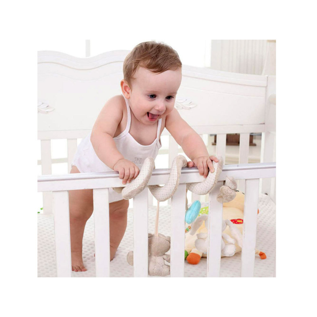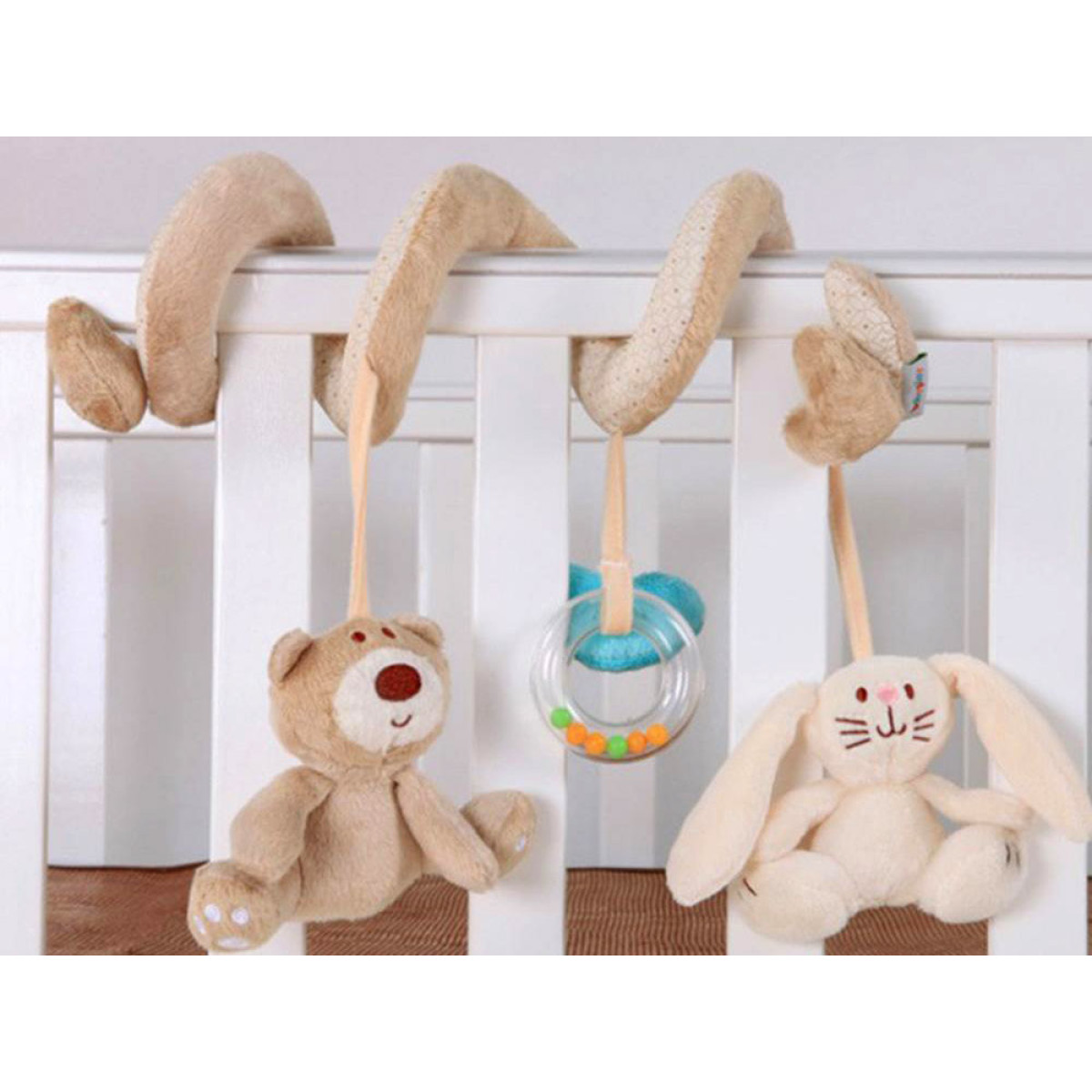 Plīša spirāle ratiņiem ar rotaļlietām ir daudzfunkcionāla, izglītojoša rotaļlieta, kas paredzēta pašiem mazākajiem. Produkts apvieno vairākas funkcijas un rūpējas par bērna pareizu attīstību no pirmajām dzīves dienām. Tas lieliski iekļaujas mūsdienīgā bērnu istabu interjerā. Spirāli var viegli piestiprināt pie ratiņiem, virs gultiņas, sēdeklīša, kulbiņas vai automašīnas sēdekļa, lai tā pavadītu bērnu visu dienu - gan mājās, gan ceļojuma laikā. Priekšrocības: spirāles forma nodrošina bērnam lielisku izklaidi, un pārdomātā konstrukcija novērš rotaļlietu atdalīšanos un pazaudēšanu. Spirālei ir pievienotas trīs piekaramās rotaļlietas: mīļais lācītis, zaķis un aplis ar krāsainām pērlītēm. Produkts ļauj bērnam iepazīt pasauli ar redzes un taustes sajūtām, sniedzot unikālus sensoriskos iespaidus.
