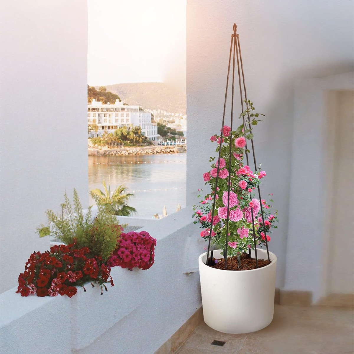 Metāla pergolas stends ziediem 150 cm ir ideāls risinājums tiem, kas vēlas papildināt savu terasi vai dārzu ar skaistiem ziediem. Stabils un izturīgs dizains nodrošina, ka jūsu augi vienmēr būs droši un labi atbalstīti.
