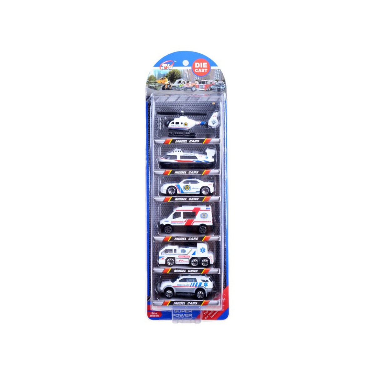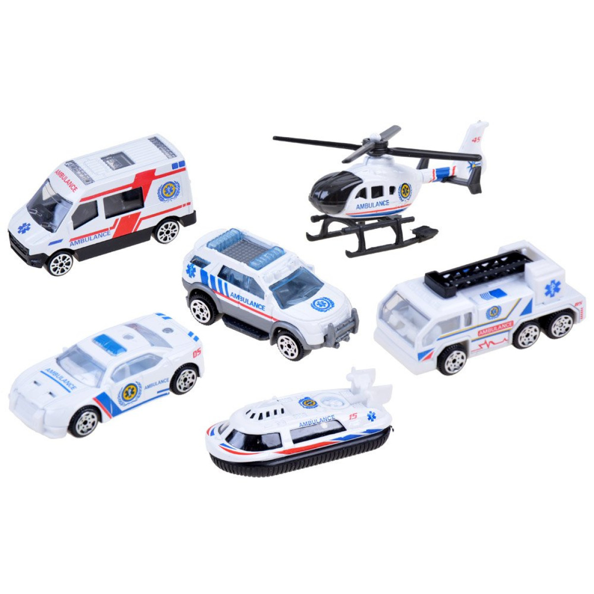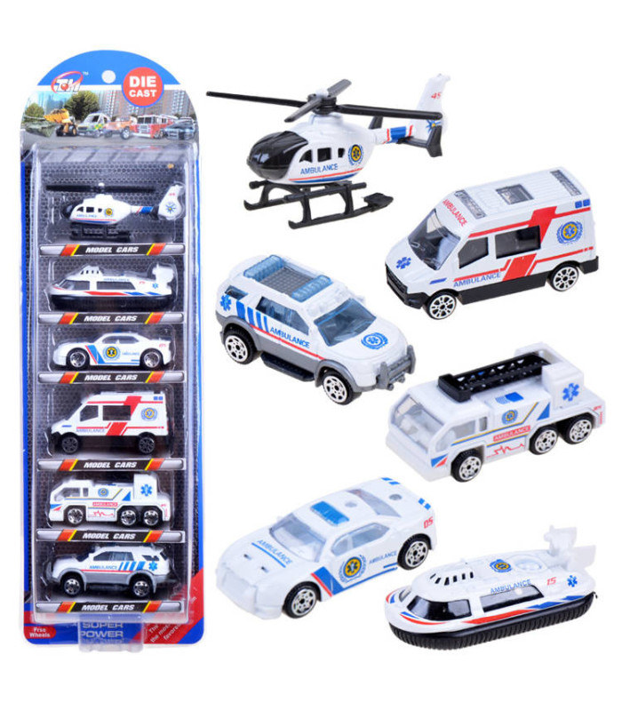 6 metāla glābšanas transportlīdzekļu komplekts - neatliekamā medicīniskā palīdzība ir labākā izvēle ikvienam, kas nebaidās no izaicinājumiem un drosmīgi glābj visus, kuriem nepieciešama steidzama palīdzība. Ar šo komplektu katrs zēns varēs glābt savas rotaļlietas no jebkādām briesmām. Metāla automašīnām ir plastmasas, kustīgi piederumi.