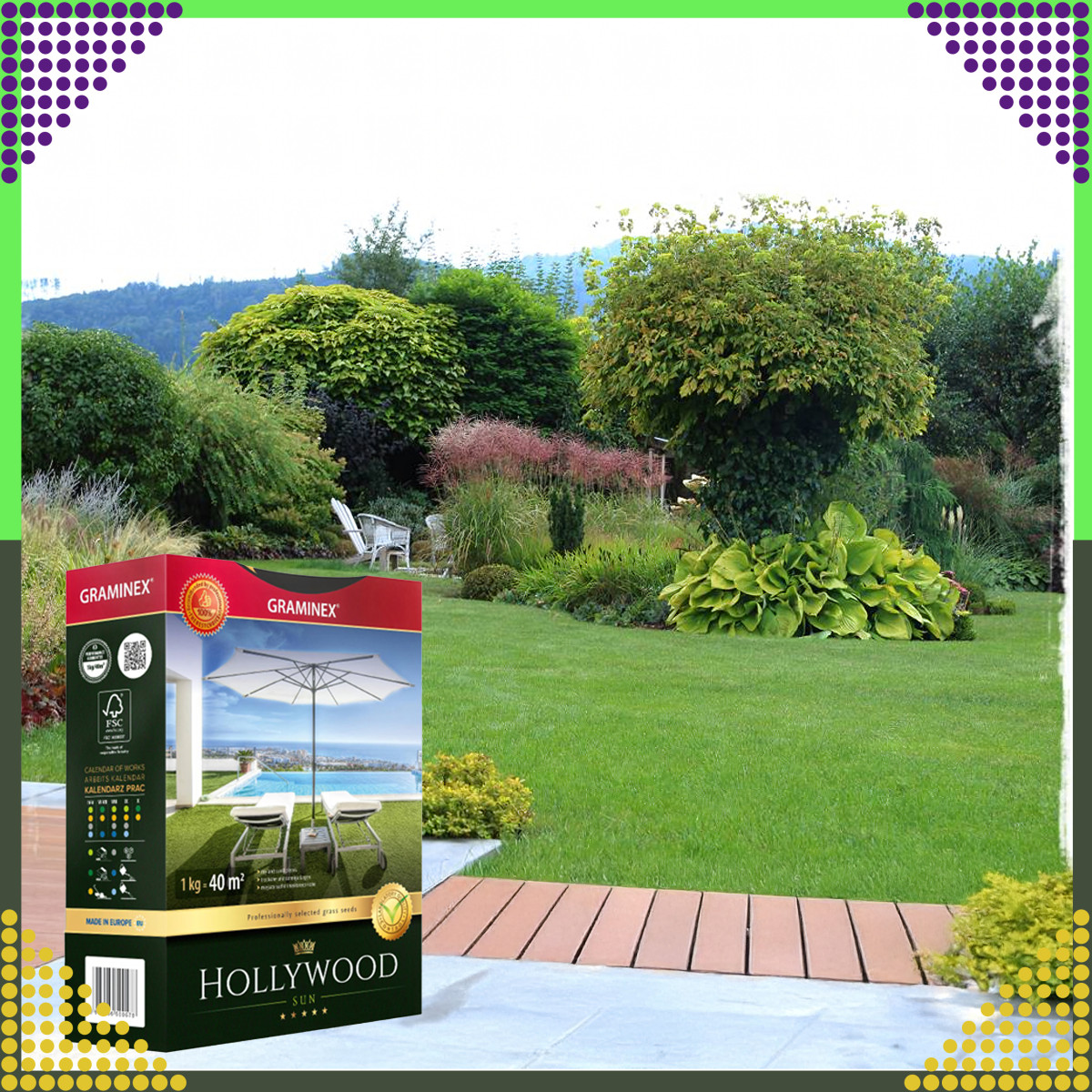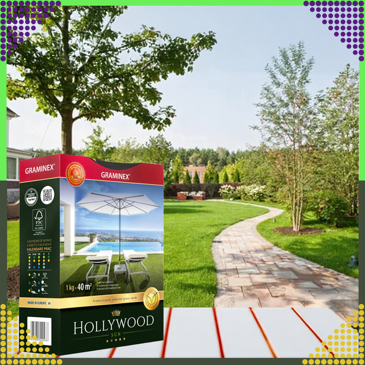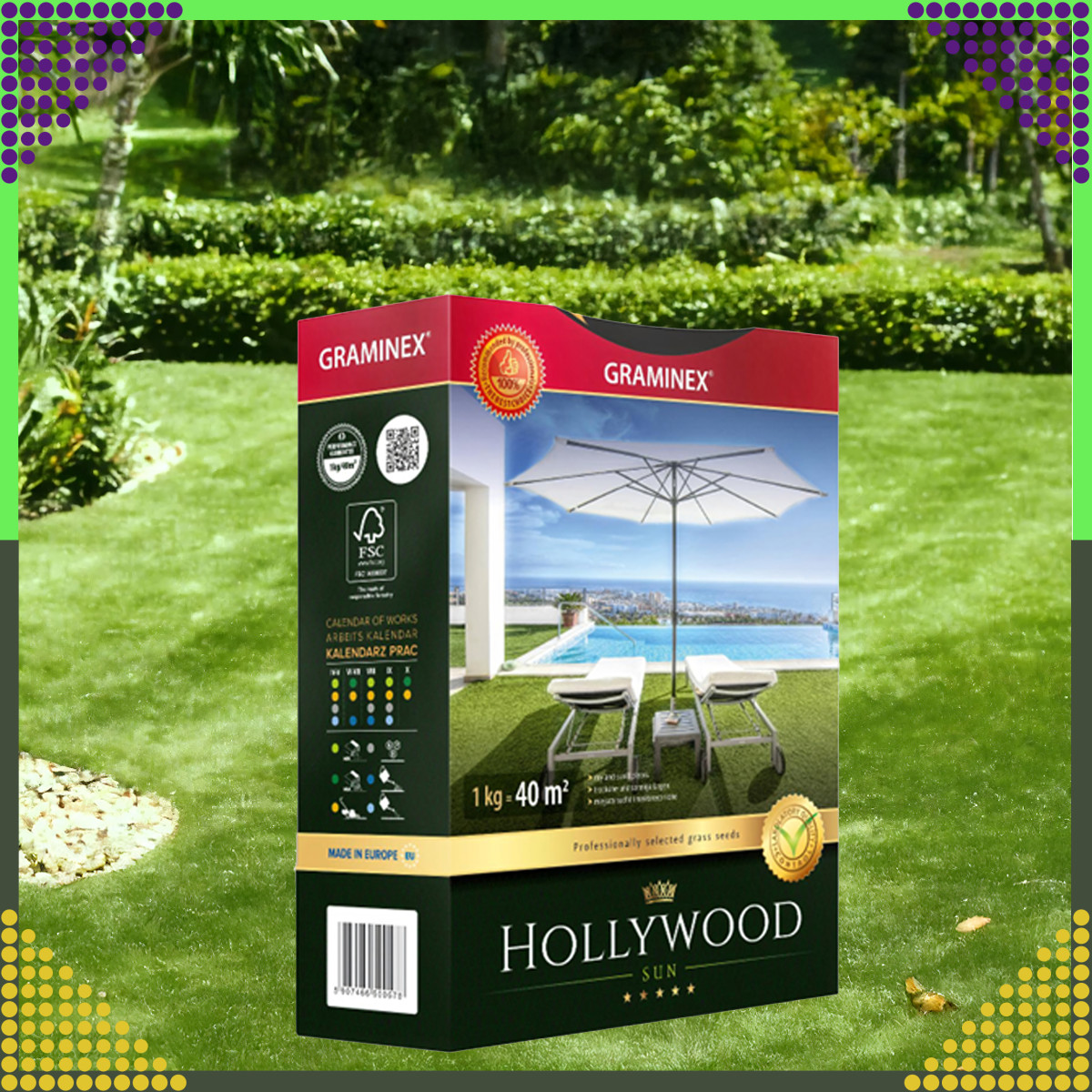 Premium zāles sēklu maisījums HOLLYWOOD 1kg ir piemērots sausām un saulainām vietām. Universālais zāles sēklu maisījums 5 kg aptver līdz pat 200 m² un ir ideāls gan lietošanas, gan dekoratīvajiem zālājiem. Tas satur izturīgas zāles šķirnes, kas nodrošina blīvu, zaļu mauriņu, kas ir izturīgs pret izbradāšanu un laikapstākļiem. To ir viegli kopt, un tas ātri izplešas. Sēšanas laiks: marts-aprīlis. Garantē skaistu mauriņu!