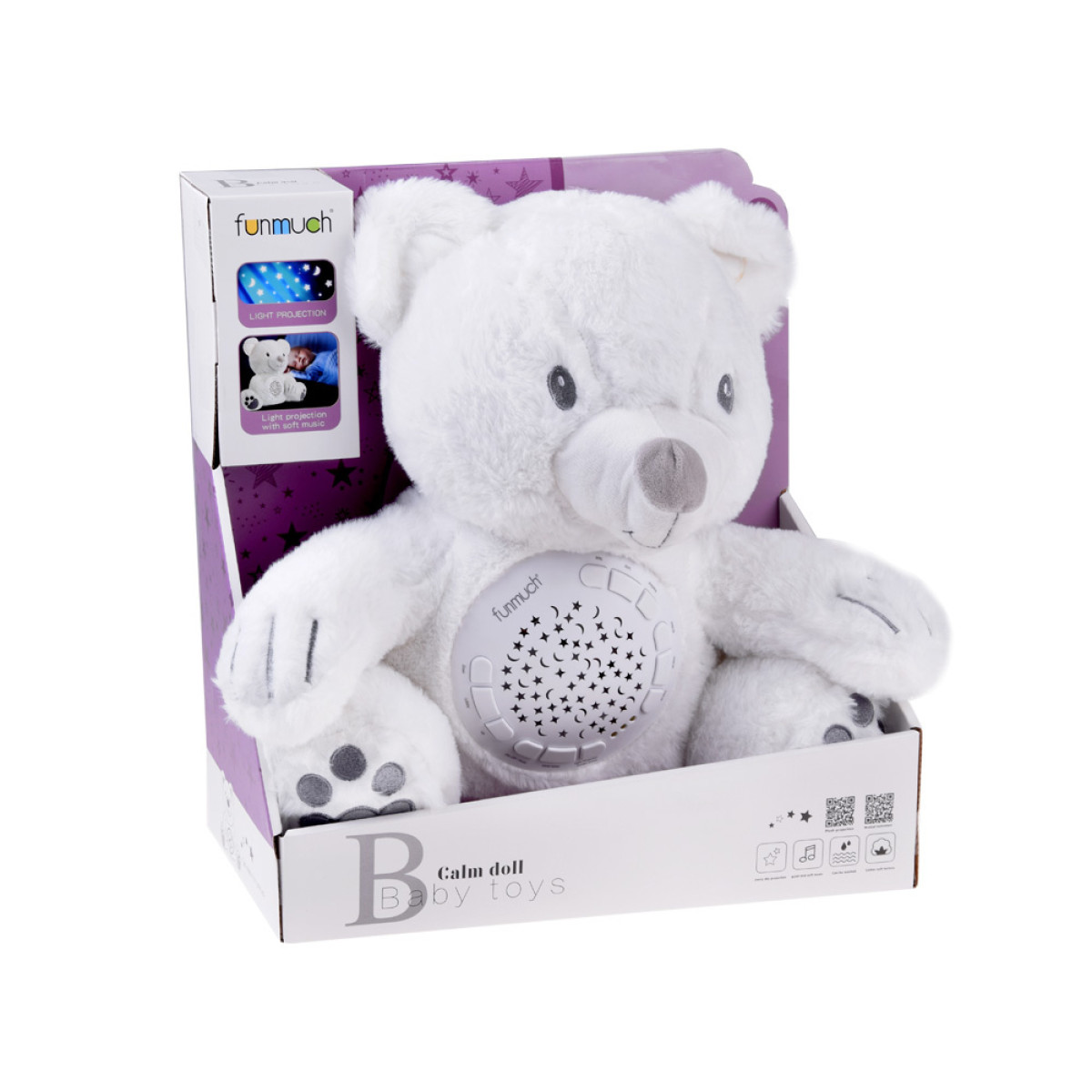 Plīša baltais lācis ar skaņas efektiem kā ideāls papildinājums bērnu istabai, var kļūt par jūsu mazuļa mīļu draugu jebkurā dienas un nakts laikā. Plīša lācis palīdzēs nomierināt mazu bērnu ar savām maigiem, mierīgiem melodijām. Krāsainas gaismas, kas veido zvaigznes un mēnešus, piepildīs bērna istabu, radot īstu sapņu zemi.