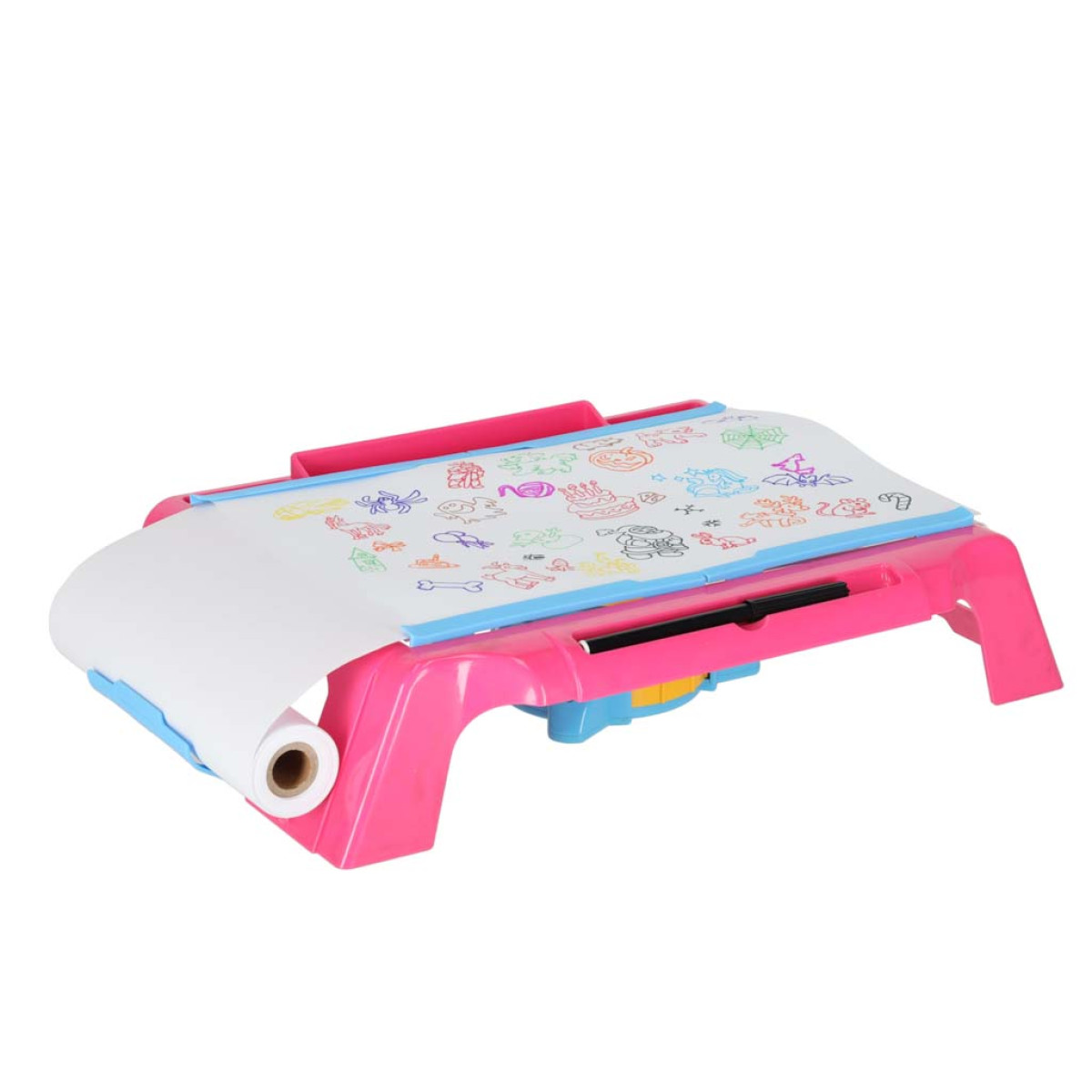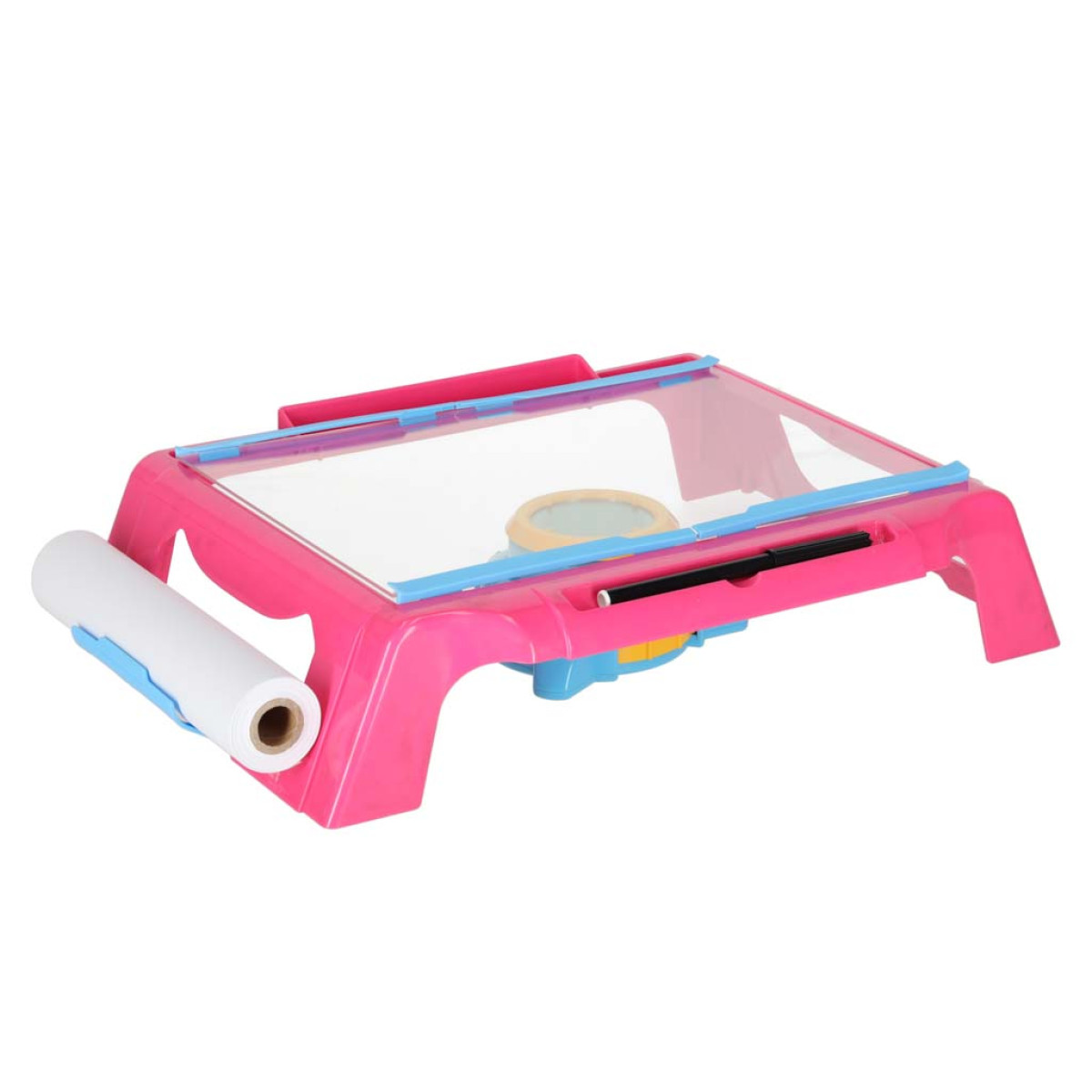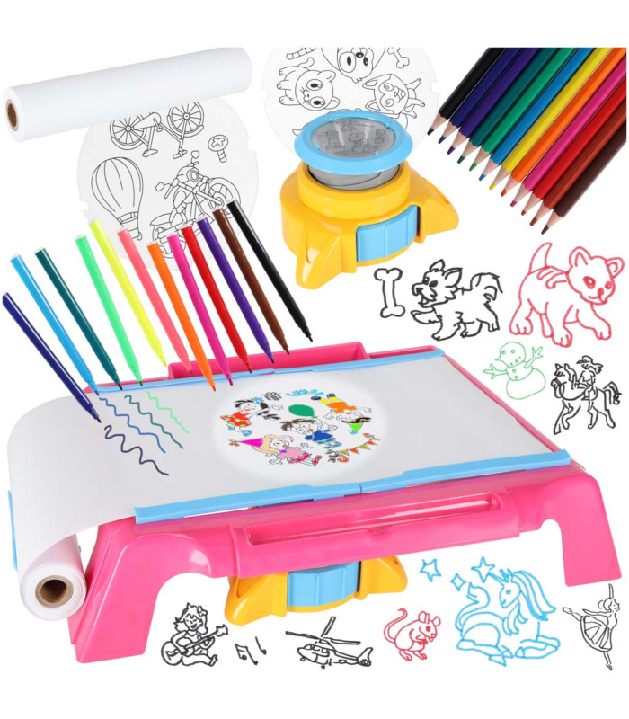 Šis krāsainais galdiņš zīmēšanai ar projektoru ir ērta un droša vieta mazajiem māksliniekiem. Pateicoties galdiņam, bērns var radīt jebkur - istabā, viesistabā vai pat dārzā. Komplektā atradīsit visu nepieciešamo: zīmēšanas papīra rulli, 12 krāsainas flomasterus, zīmēšanas piederumu komplektu un gatavus attēlus, kas atvieglo sākumu. Spēlēšanās ar komplektu ir bērnišķīgi vienkārša - ielieciet slaidu, noregulējiet asumu un ļaujiet iztēlei darboties!