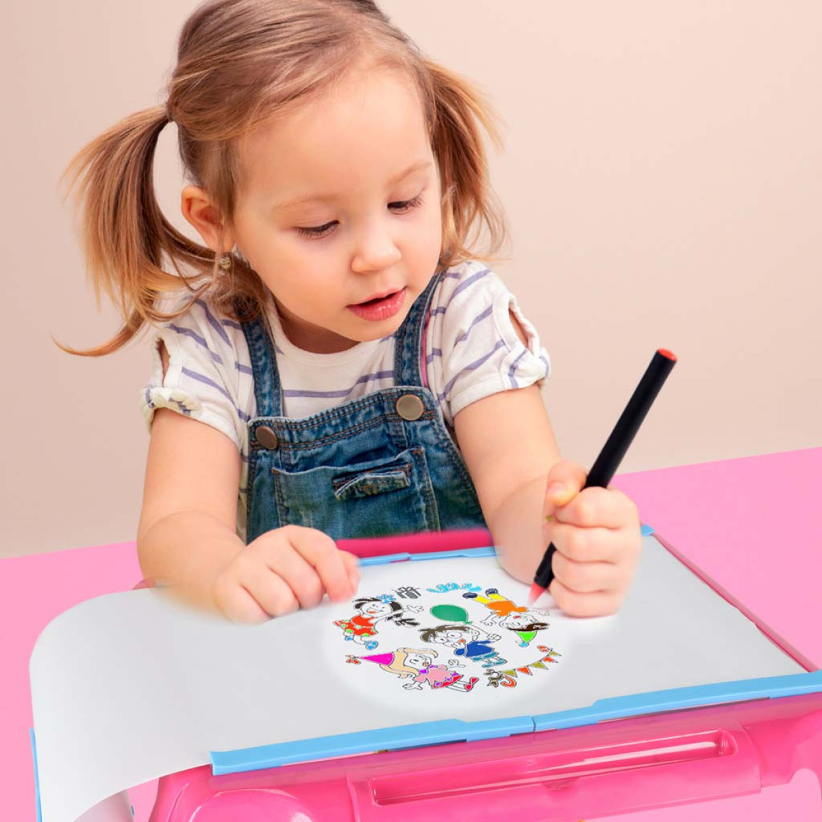 Šis zīmēšanas galdiņš ir īsts radošuma centrs! Pateicoties burvīgajam izglītojošajam projektoram un tā maigajai gaismai, bērnam zīmēšanas apguvē pievienojas maģija un prieks. Krāsošana attīsta manuālās prasmes, stimulē bērnu radošumu un modina māksliniecisko ziņkāri.