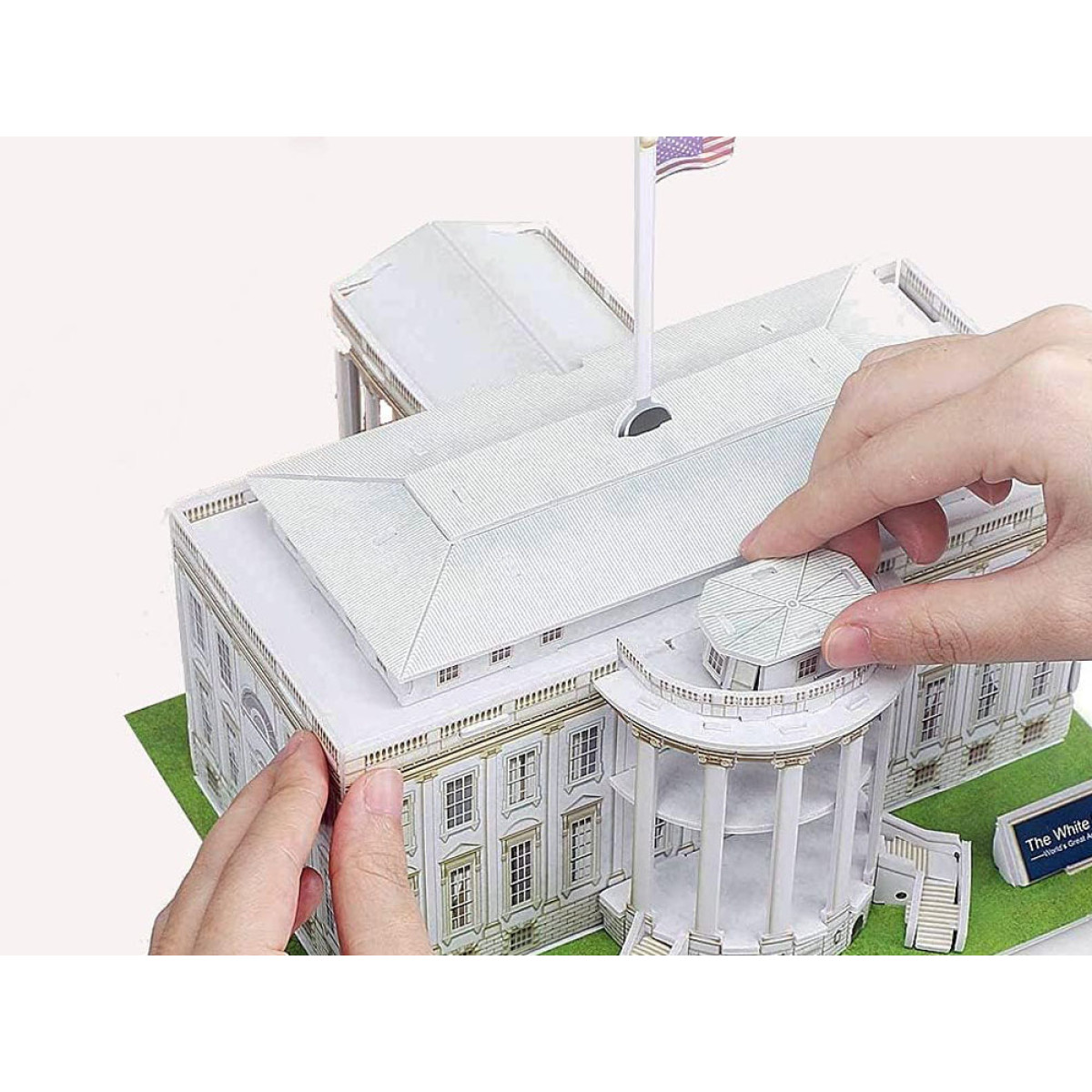 Telpiskās 35 elementu puzles, kas attēlo slaveno Amerikas Balto namu, noteikti aizraus ikvienu mazo 3D puzļu un modelēšanas entuziastu. Katrs puzles elements ir izvietots uz īpašiem loksnēm. To salikšana neprasa asus priekšmetus vai līmi.
