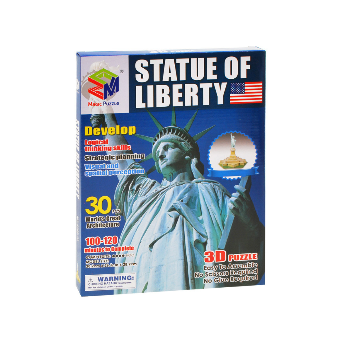 Izbaudiet 30 elementu puzles ar slaveno Amerikas Brīvības statuju, kas noteikti aizraus ikvienu mazo 3D puzles vai modelēšanas entuziastu. Katrs puzles elements ir novietots uz speciāliem lokšņu papīriem, un to salikšanai nav nepieciešami ne asi priekšmeti, ne līme.