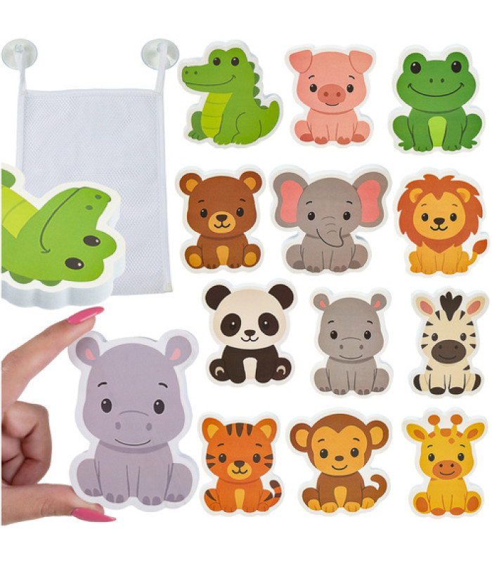 Komplekts ar 12 krāsainām putām padara vannas laiku par jautru un izglītojošu pieredzi. Dzīvnieki pielīp pie vannas un flīzēm, un pēc spēlēšanās tie tiek ievietoti organizerī ar piesūcekņiem, kas nodrošina ātru žāvēšanu un kārtību vannas istabā.