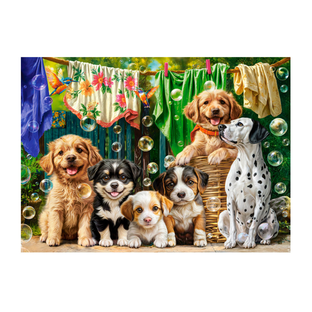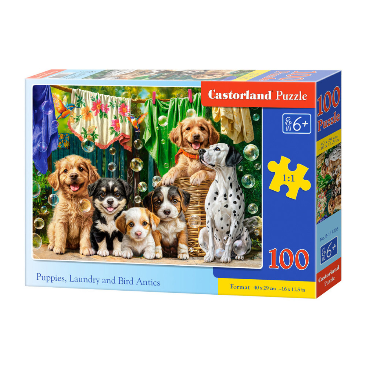 Puzles salikšana no 100 rūpīgi saskaņotiem gabaliem rada attēlu, kura izmēri ir 40 × 29 cm, un tas attēlo jautrus kucēnus, kuri rotaļājas dārzā starp izkārto veļu un zinātkāriem putniņiem.