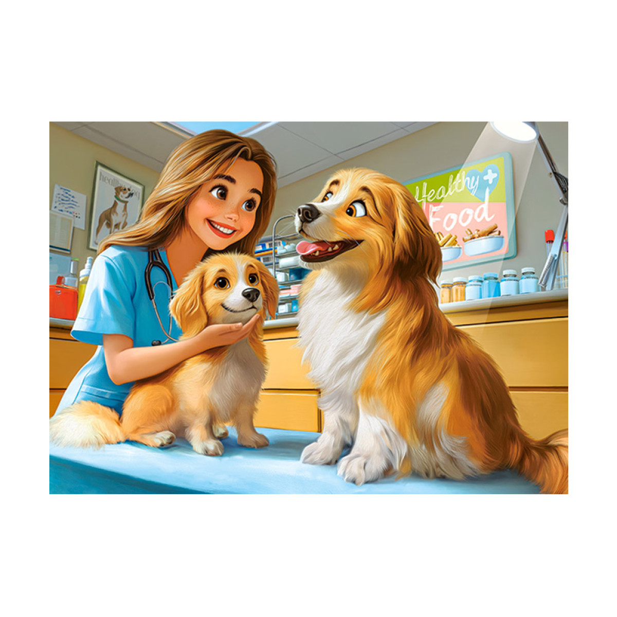 Piedzīvo smaidu un suņu enerģijas pilnu pasauli ar burvīgo puzles komplektu 'Suņi pie veterinārārsta' no Art Collection sērijas. Saliekot 120 precīzi pielāgotus gabalus, veidojas attēls ar izmēru 32 × 23 cm, kas attēlo jautrus suņus veterinārārsta apmeklējuma laikā - ainu, kas ir pilna humora un draudzīgas atmosfēras.