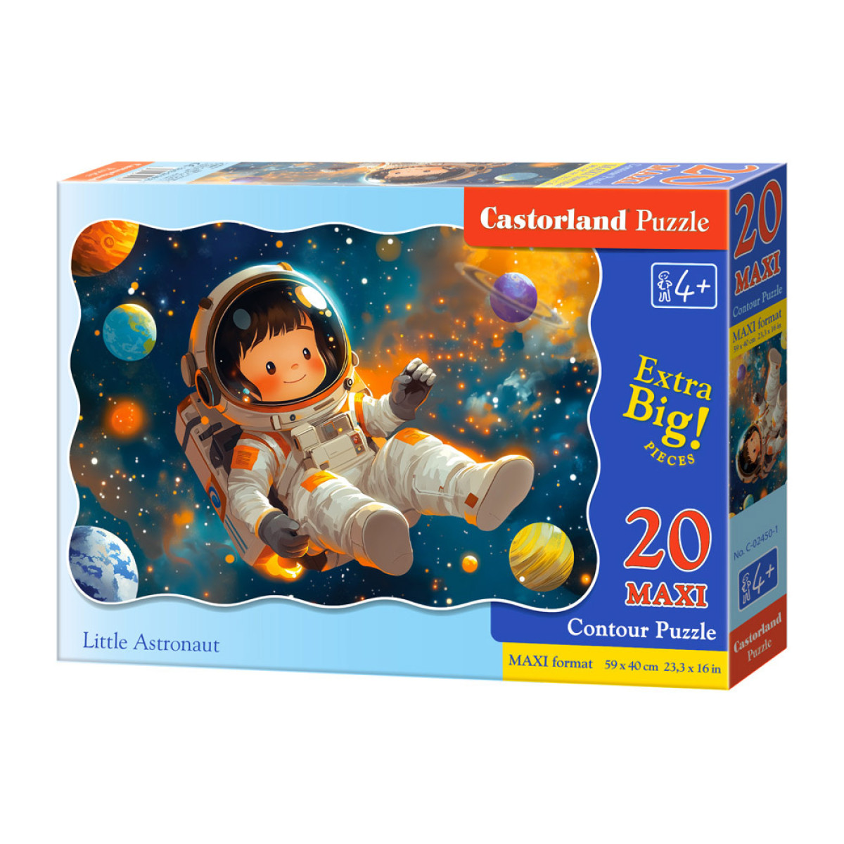 Piedalieties kosmiskā piedzīvojumā ar MAXI Little Astronaut puzli! Šis komplekts sastāv no 20 lieliem, viegli satvērtiem gabaliem, kas ir ideāli piemēroti mazām rokām. Pēc salikšanas tiek izveidots krāsains attēls, kas attēlo jauku astronautu kosmosā, ieskautu zvaigznēs, planētās un raķetēs.