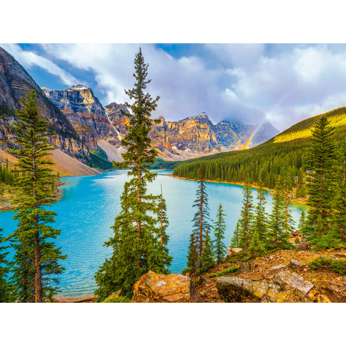 Puzzle Moraine Lake, Banff Nacionālais parks, Kanāda ir unikāls piedāvājums dabas, kalnu ainavu un izaicinošu pužļu cienītājiem. Attēlā redzama viena no skaistākajām Kanādas vietām – tirkīza krāsas Moraine ezers, ko ieskauj majestātiskie Klinšu kalnu virsotnes un blīvi skujkoku meži.