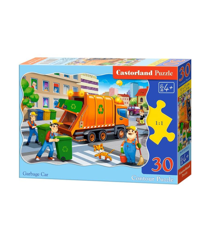 Puzzle 30 elementu komplekts Atkritumu Mašīna ir īpaši krāsains un aizraujošs piedāvājums maziem bērniem. Puzles midi sastāv no 30 elementiem. Pēc salikšanas veidojas attēls ar izmēru 32 x 23 cm. Augsta kvalitāte un estētiskās krāsas piesaistīs katru bērnu puzles likšanai.