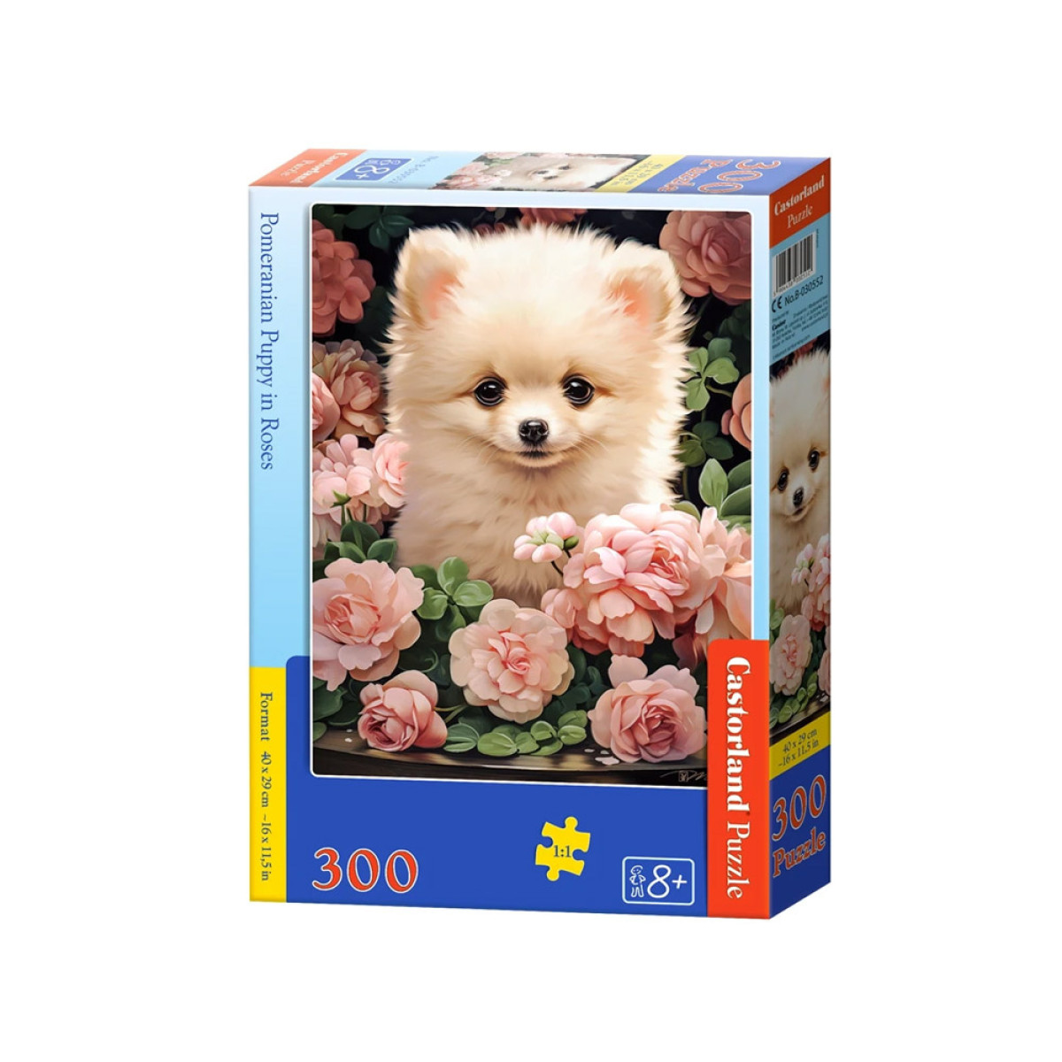 300 gabalu puzles Pomerānijas kucēns rozēs