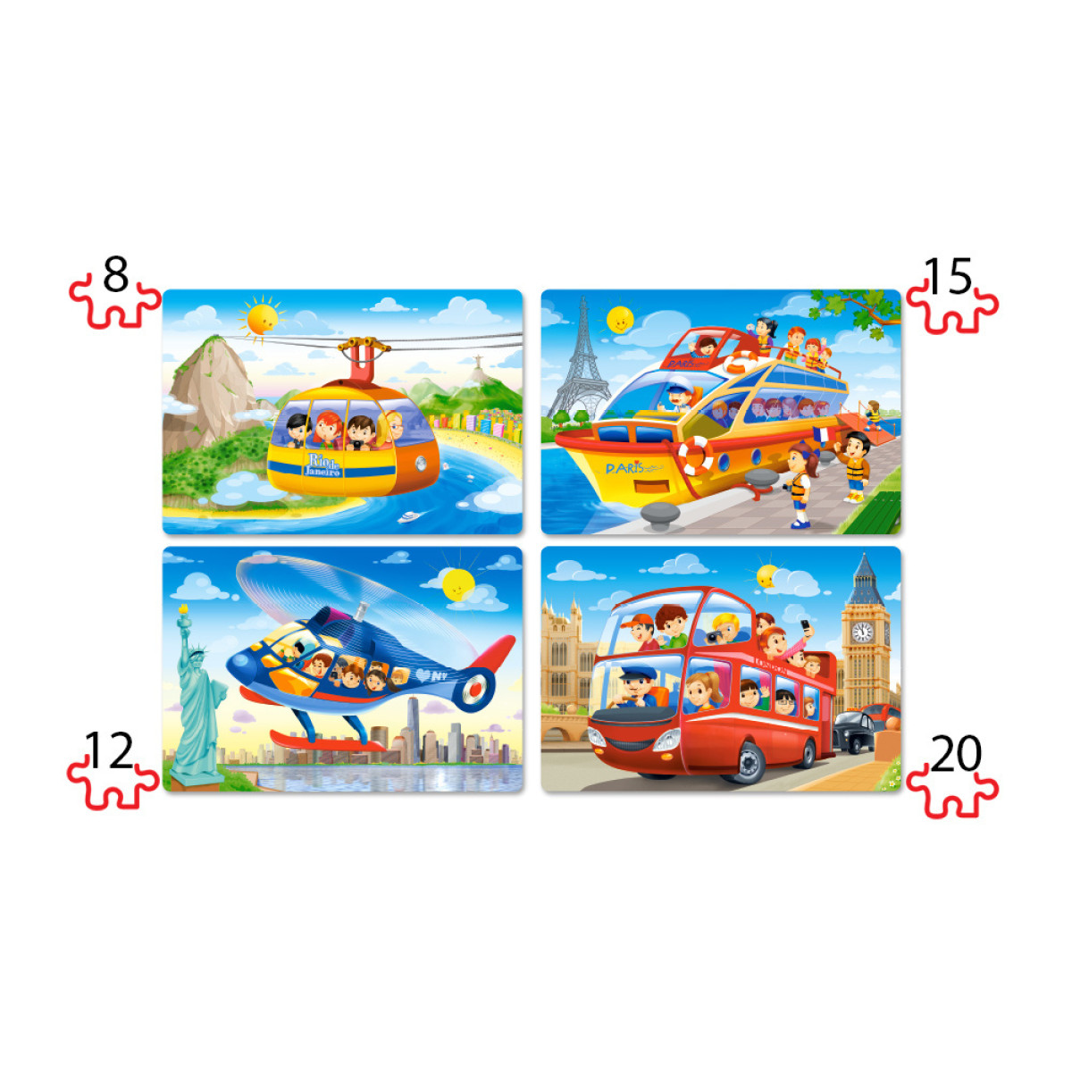 Puzzle 4 x Kontūra 8+12+15+20 elementi ir puzles bērniem, kas sastāv no četriem atsevišķiem attēliem ar dažādu sarežģītības pakāpi. Spilgtas krāsas, rūpīgi izvēlēti dizaini un lieli elementi padara to viegli saliekamu mazam bērnam. Šīs puzles aicina iepazīt aizraujošo pasaku, dzīvnieku un transporta pasauli. Tās palīdz attīstīt asociāciju spējas un uzlabo manuālo prasmi.