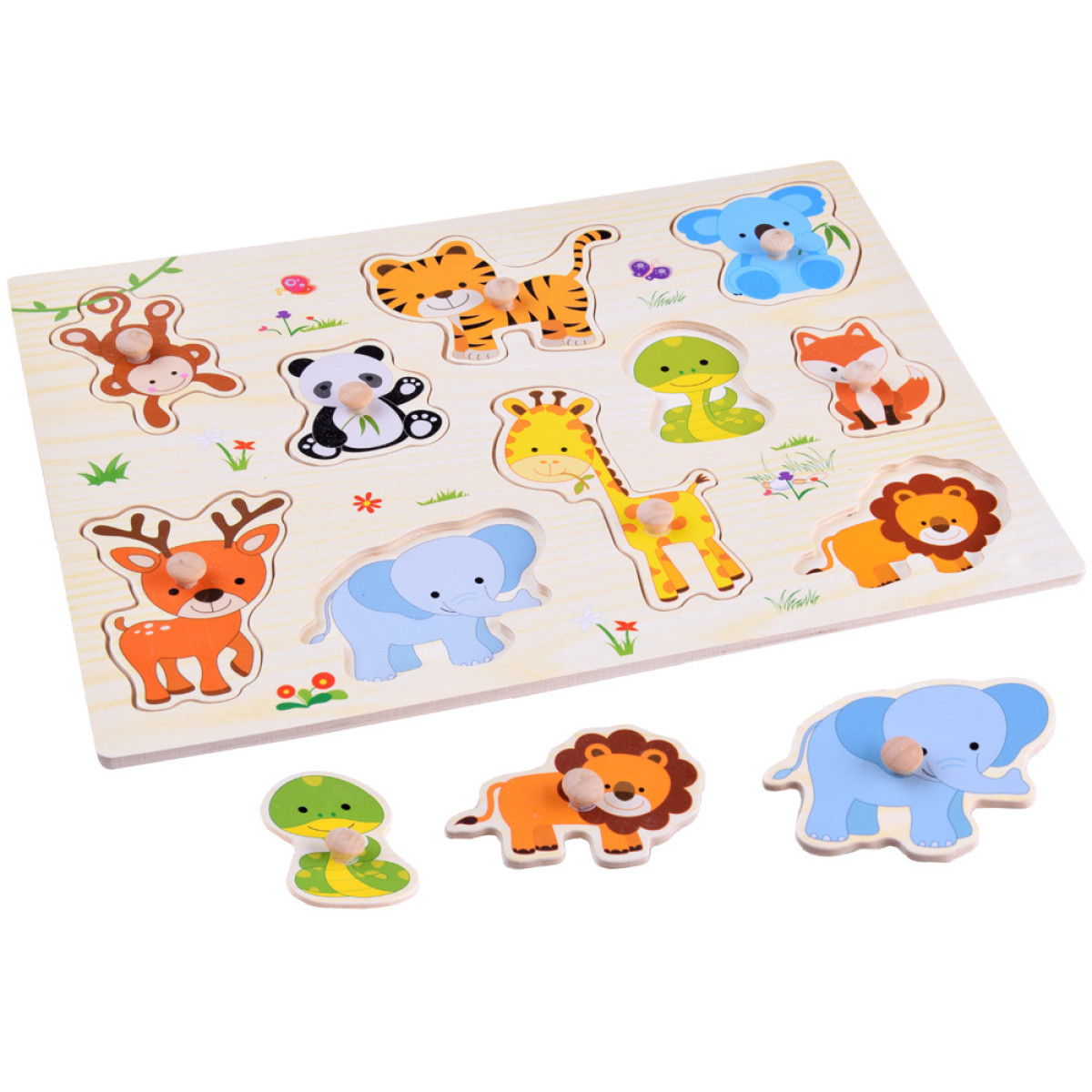 koka puzle ar mīļiem dzīvniekiem apvieno mācīšanos un jautru spēli. Spēlējoties bērns var attīstīt salīdzināšanas prasmes, vērību un roku un acu koordināciju. Šī puzle palīdz arī iepazīt dažādus dzīvniekus un to formas. Tā ir lieliska izvēle daudzām aizraujošām un lietderīgām spēļu stundām.