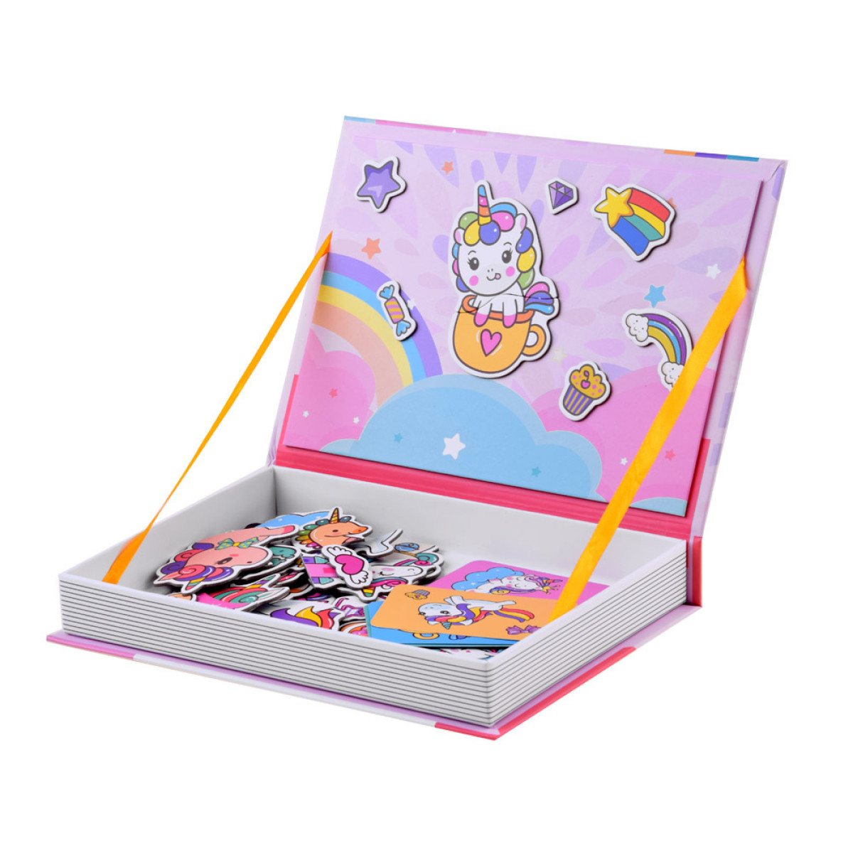Krāsainais iepakojums ir izgatavots no cieta kartona grāmatas formā. Magnētiskā tāfele ir vāka iekšpuse, un, atverot, tā kalpo kā tāfele. Rotaļas laikā bērni attīsta manuālo veiklību, formas atpazīšanas prasmes, novērošanas spējas, kā arī veicina iztēli un radošumu. Jokomisiada veikals piedāvā plašu radošo, izglītojošo rotaļlietu un puzļu klāstu bērniem.