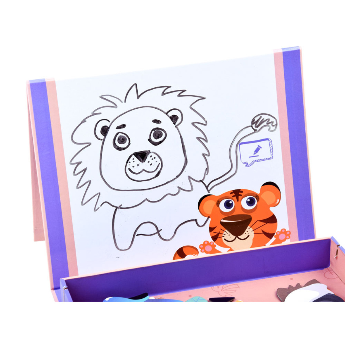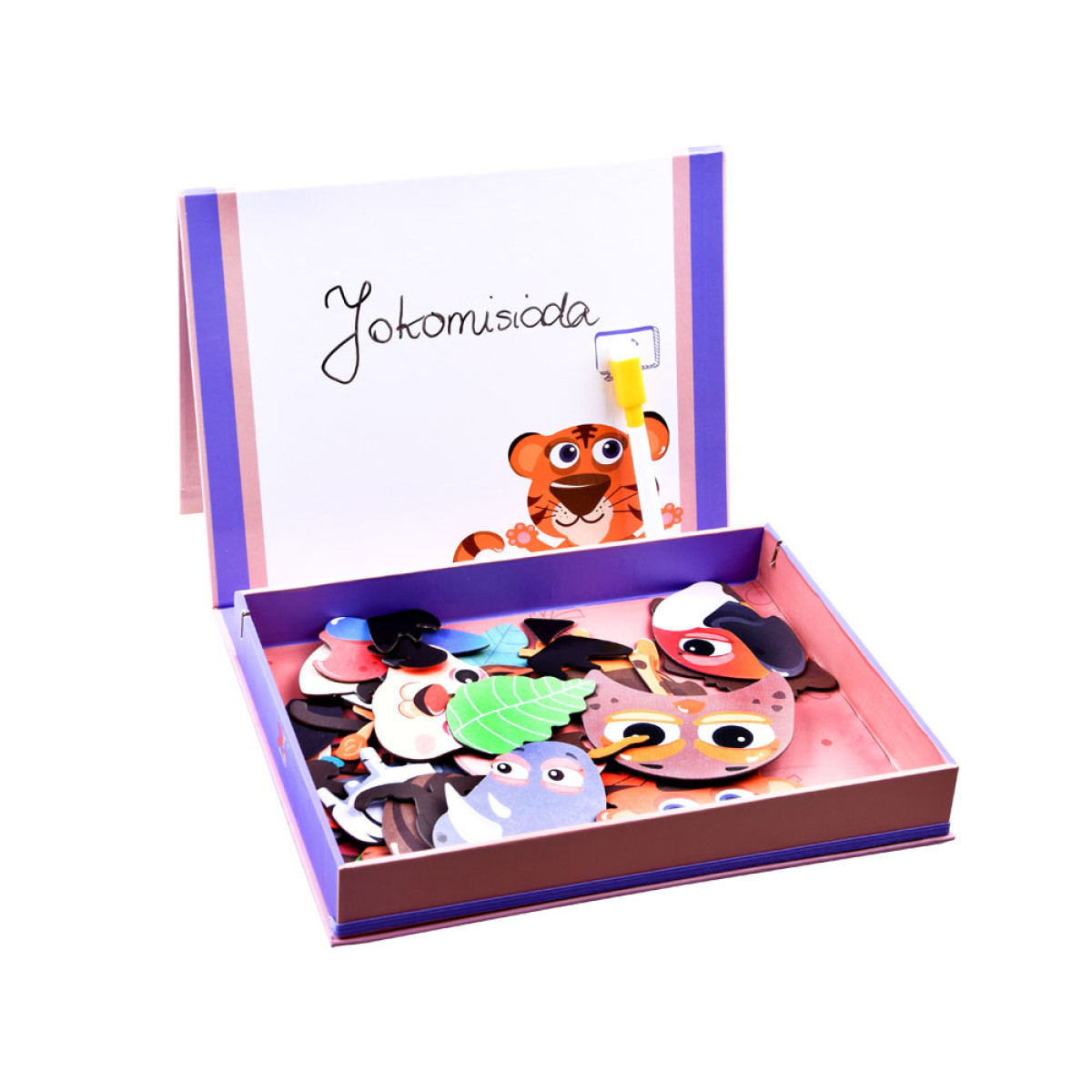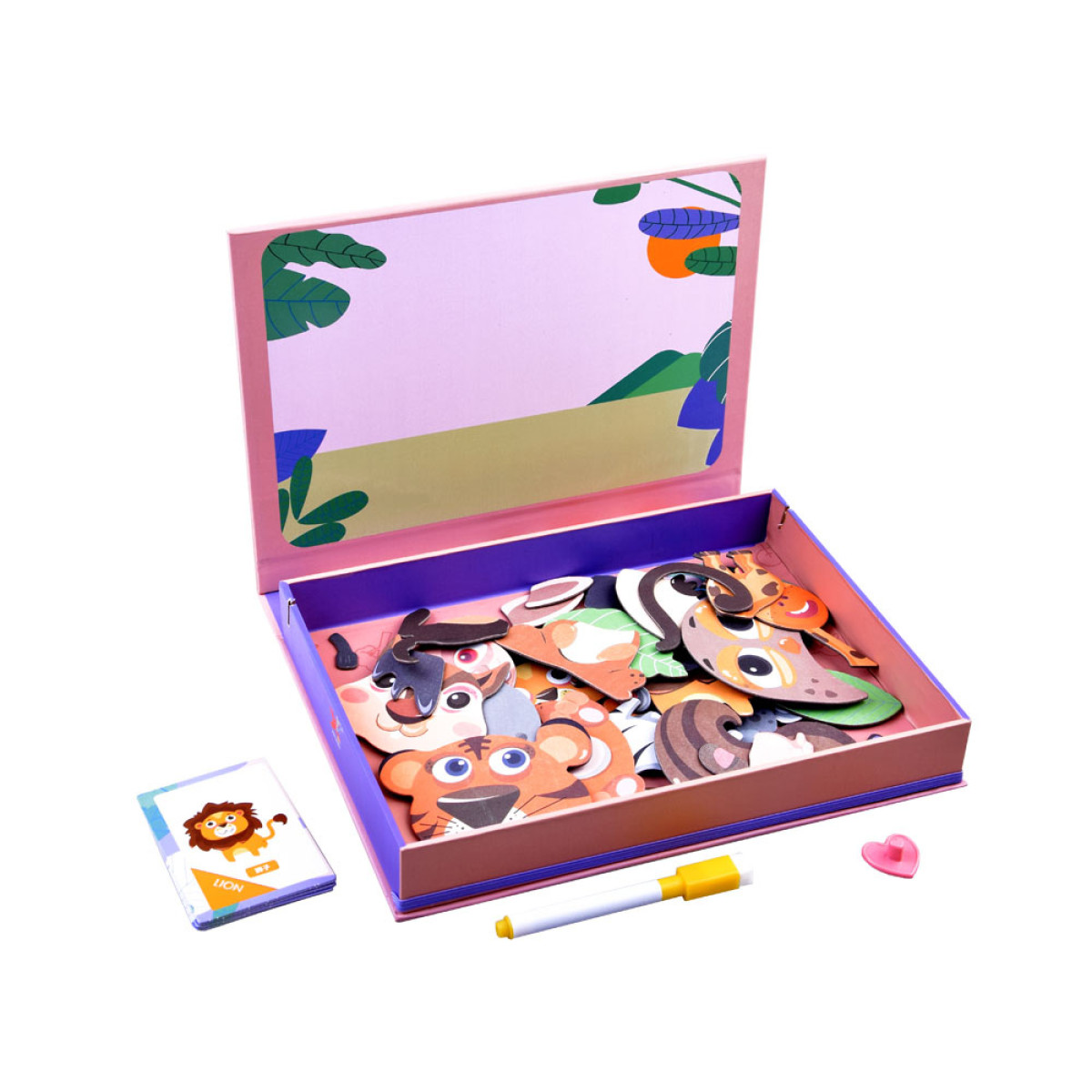 Magnētiskās dzīvnieku puzles ir lieliska izklaide meitenēm un zēniem. Komplektā ietilpst krāsaini magnēti, kurus var sakārtot uz magnētiskās tāfeles, padarot to par lielisku spēli arī ceļojuma laikā. Mīkla piedāvā daudz iespēju - papildus magnētiskajām puzlēm var izmantot arī izvelkamo sausās tīrīšanas tāfeli, lai radītu skaistus zīmējumus pēc savas idejas vai atdarinātu dzīvniekus no komplektā iekļautajām 10 kartēm.