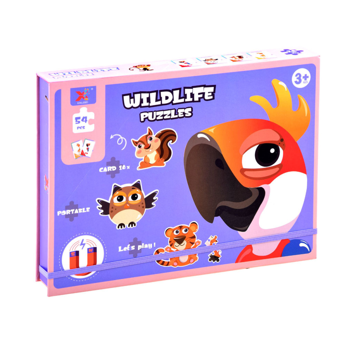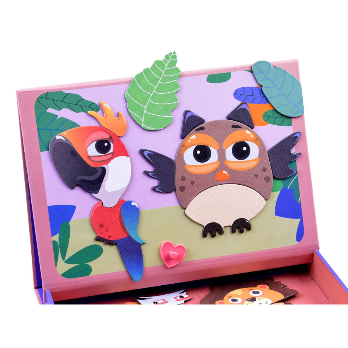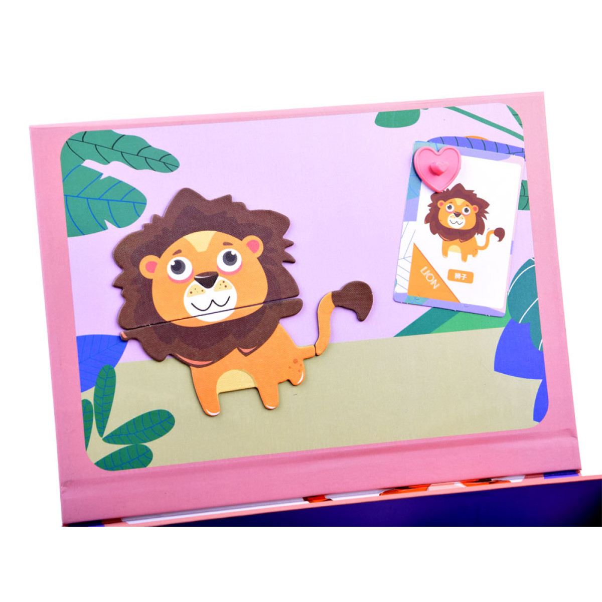 Magnētiskās dzīvnieku puzles ir lieliska izklaide meitenēm un zēniem. Komplektā ietilpst krāsaini magnēti, kurus var sakārtot uz magnētiskās tāfeles, padarot to par lielisku spēli arī ceļojuma laikā. Mīkla piedāvā daudz iespēju - papildus magnētiskajām puzlēm var izmantot arī izvelkamo sausās tīrīšanas tāfeli, lai radītu skaistus zīmējumus pēc savas idejas vai atdarinātu dzīvniekus no komplektā iekļautajām 10 kartēm.