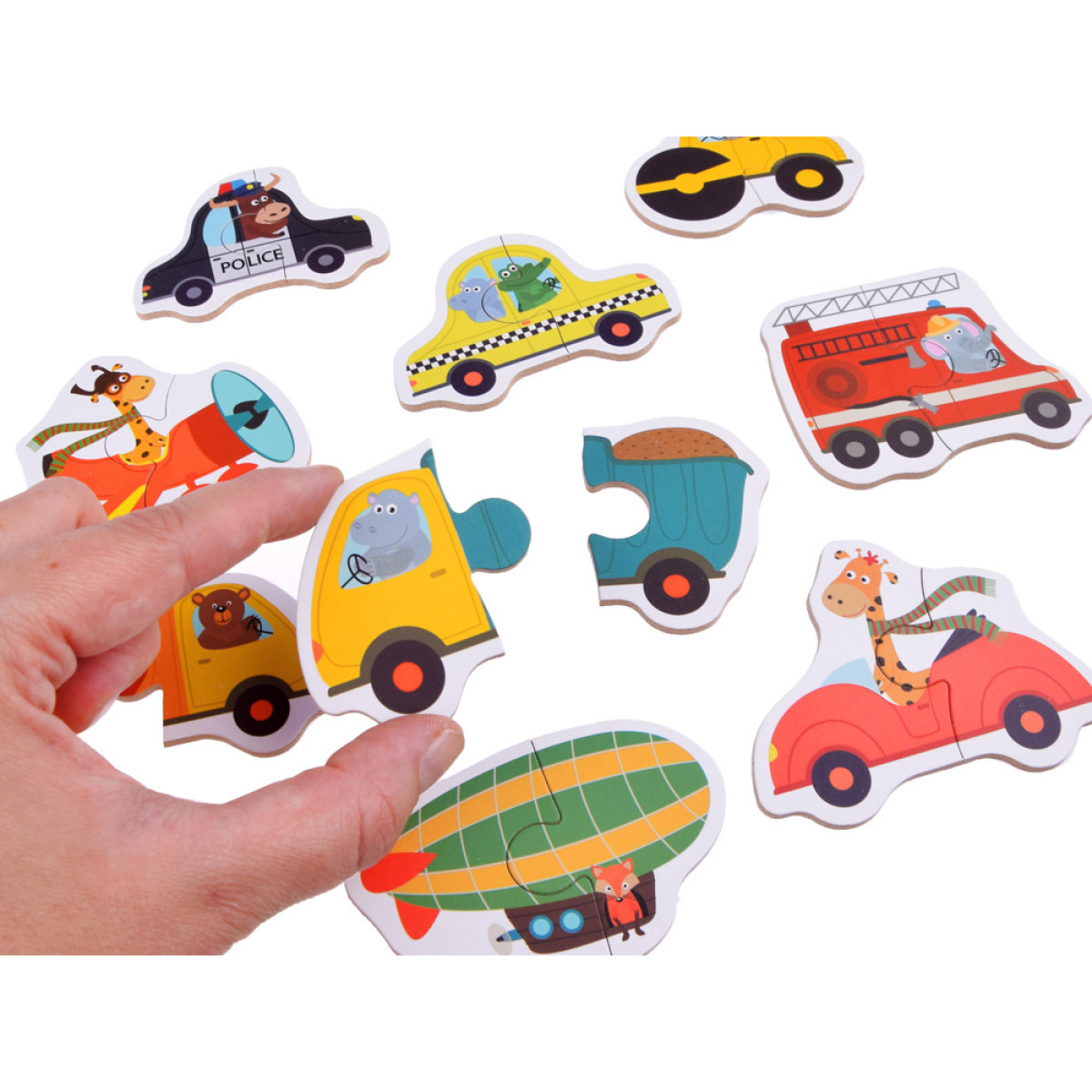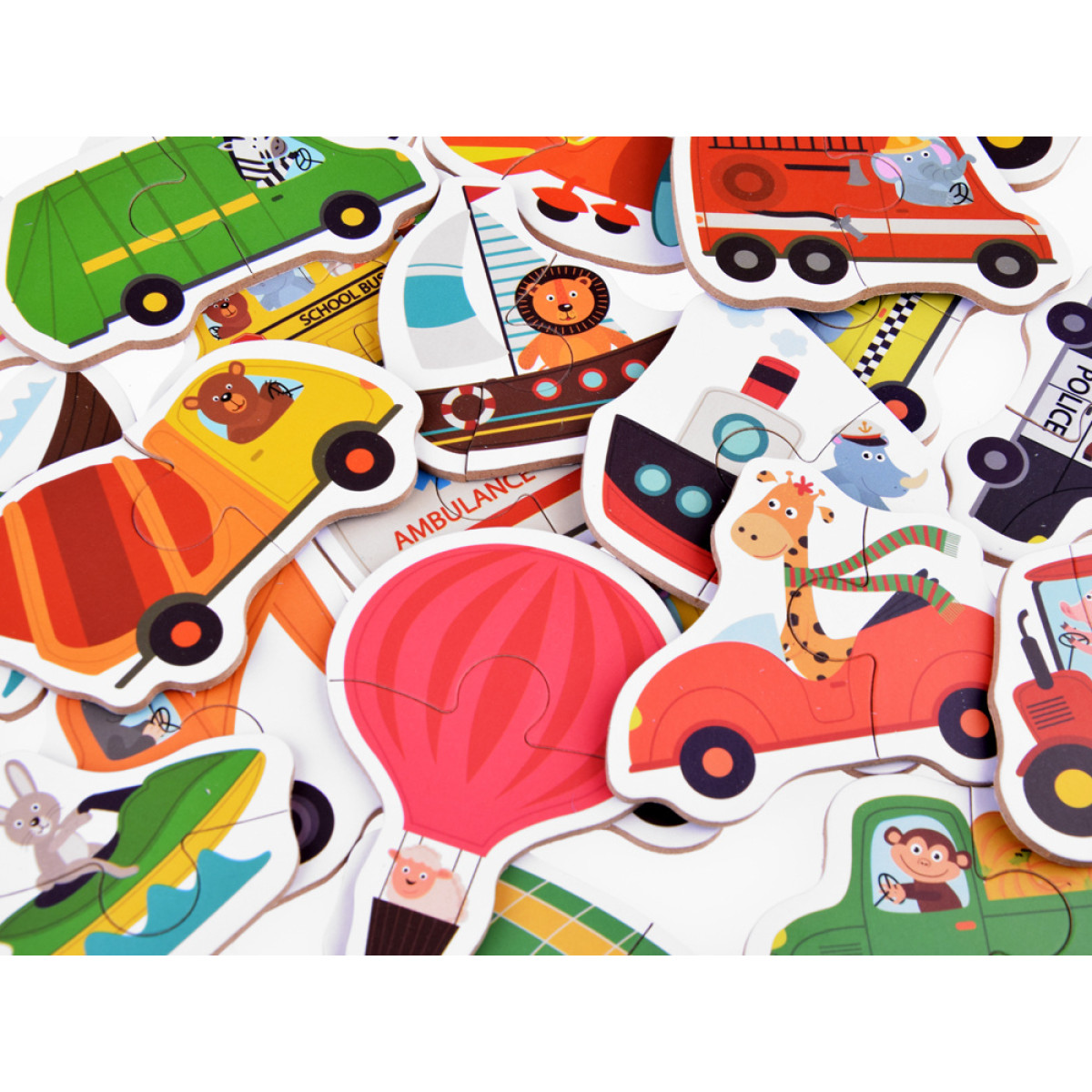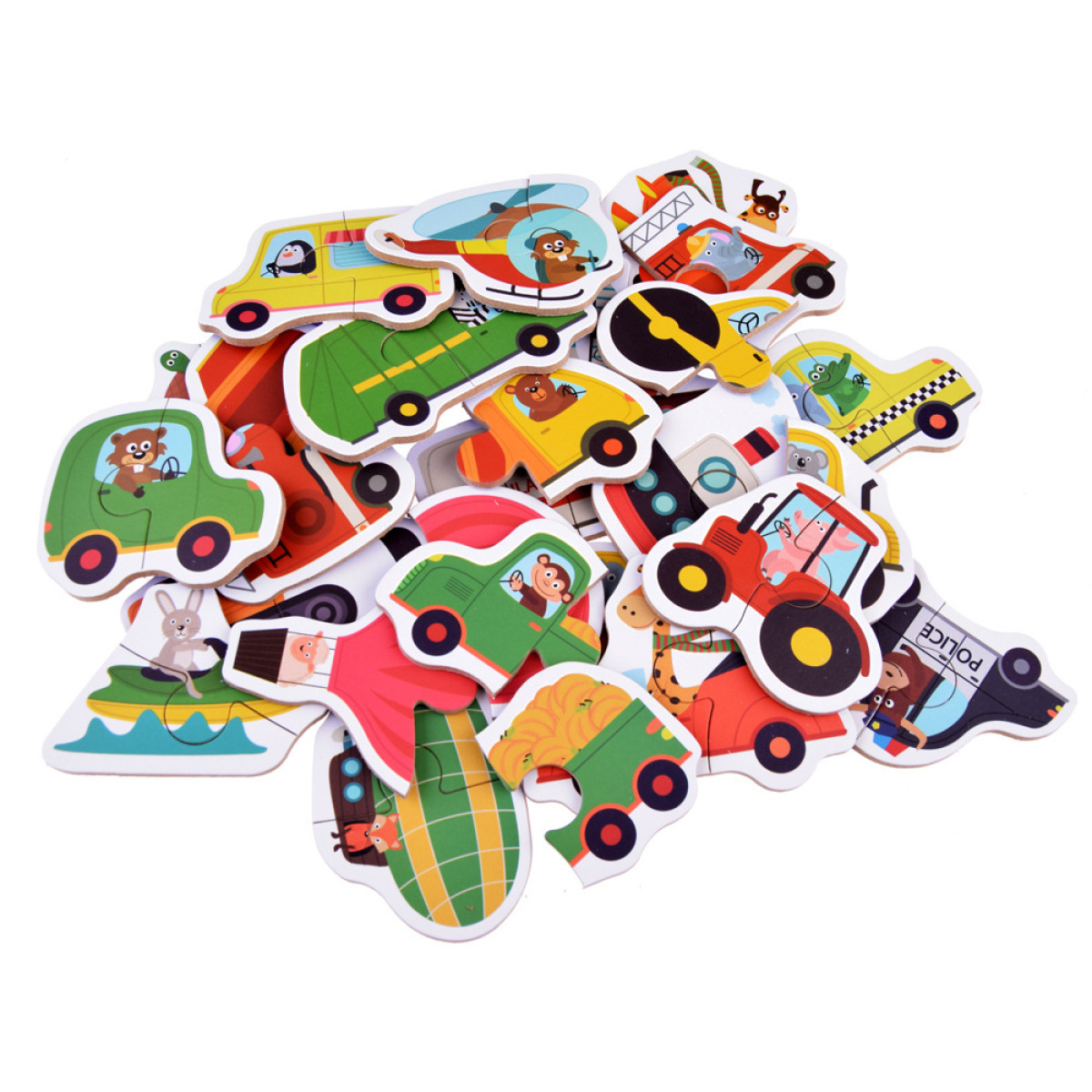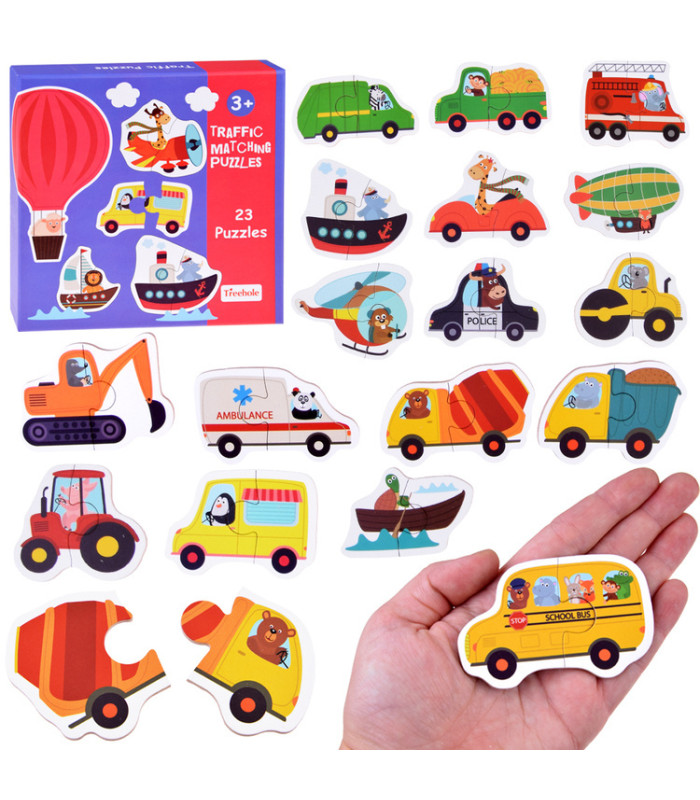 Brīnišķīgs un krāsains puzles komplekts ar transportlīdzekļiem piemērots bērniem no 3 gadu vecuma. Lielās puzles sastāv no divām daļām, kas ļauj veidot attēlu ar noteiktu transportlīdzekli. Papildus jautrībai, puzles apakšā ir uzraksti angļu un ķīniešu valodā, tāpēc bērns spēles laikā var uzreiz apgūt auto vai transportlīdzekļa nosaukumu svešvalodā. Puzles ir ideālas, lai sāktu piedzīvojumu ar puzlēm. Puzļu likšana attīsta vizuālo atmiņu un telpisko iztēli, māca pacietību un loģisko domāšanu, kā arī ļauj trenēt smalko motoriku.