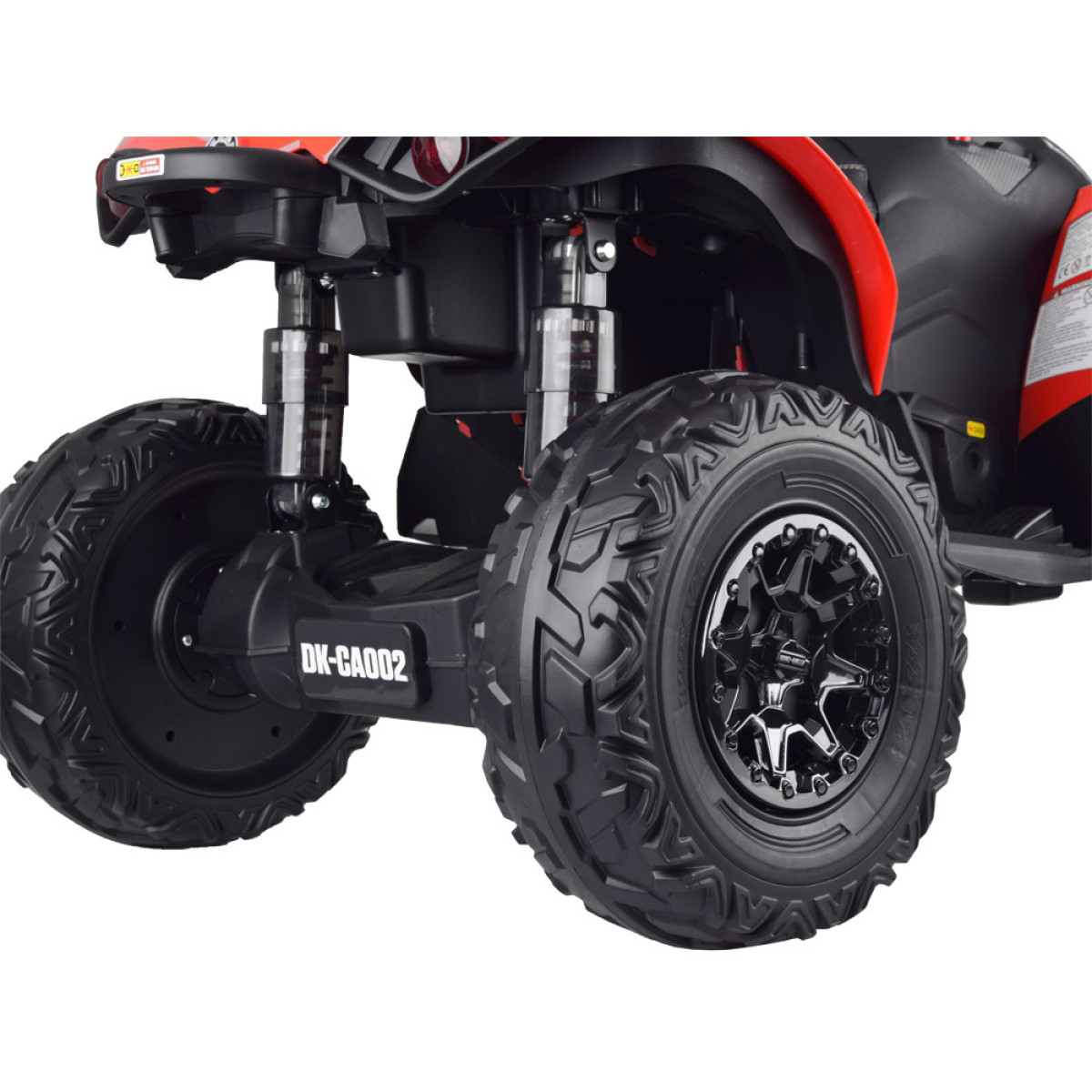 modelis ir aprīkots ar 2 jaudīgiem 24 v 200 w motoriem un 24 v 5 ah akumulatoru, tāpēc tas viegli tiek galā ar nelīdzenumiem, pauguriem un zāli. kvadracikls tiek iedarbināts ar sarkanu pogu, un pēc ieslēgšanas bērns dzird motora iedarbināšanas skaņu. braukšana sākas, nospiežot gāzes pedāli labajā kāju balstā.