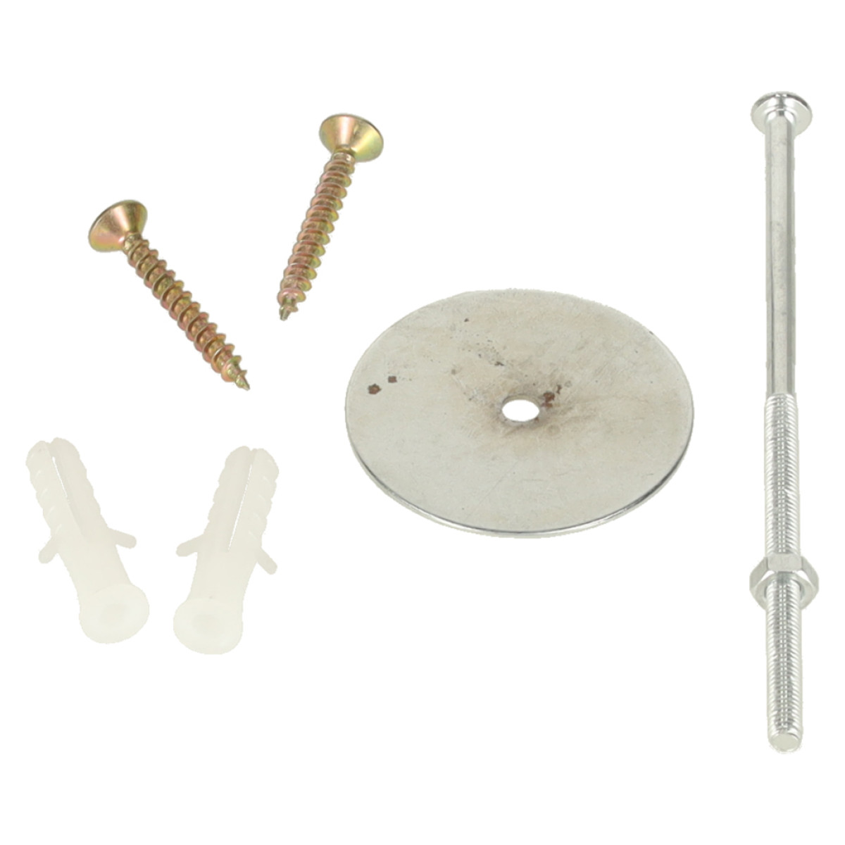 - Montāžas komplekts: 4 cm diametra riņķis, 10 cm garš skrūve ar uzgriezni un 2 skrūves ar dībeļiem 3 cm garumā