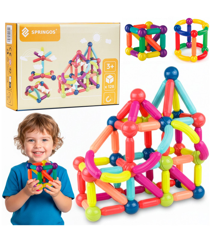 Springos KG0050 ir daudzkrāsains magnētiskais konstruktora komplekts ar 128 daļām, kas piedāvā plašas radīšanas un būvēšanas iespējas. Daļas viegli savienojas, pateicoties iebūvētajiem magnētiem, ļaujot veidot dažādas formas, piemēram, mājas, torņus, tiltus vai transportlīdzekļus. Spēle veicina radošumu, loģisko domāšanu un smalko motoriku. Konstruktors izgatavots no droša plastmasas materiāla bez BPA un ar CE sertifikātu, nodrošinot drošu un ilgstošu spēli bērniem no 3 gadiem.