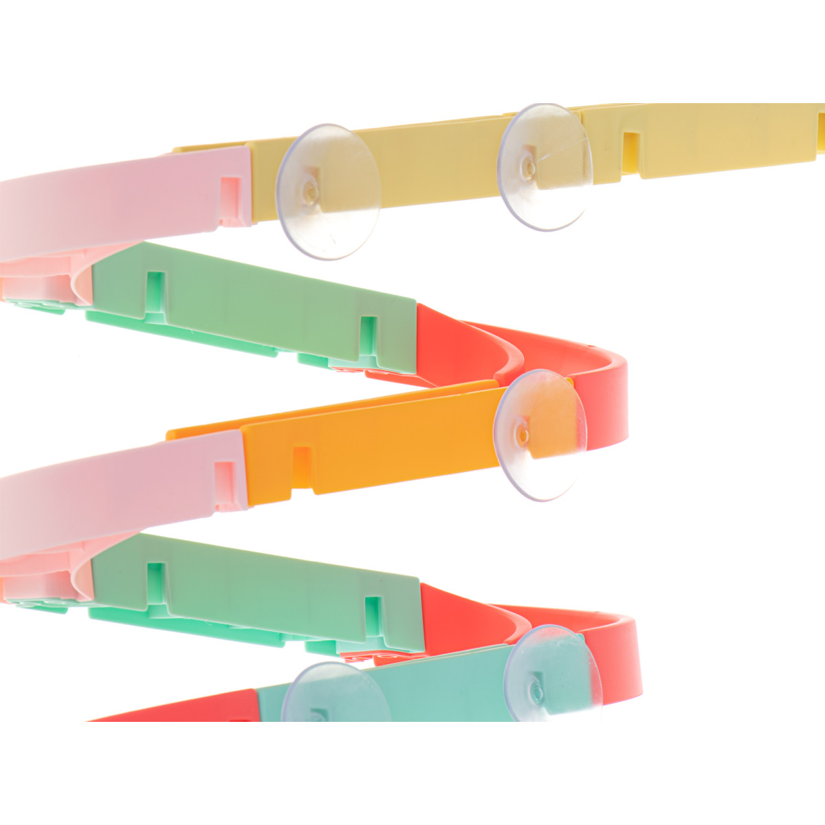 Rotaļlietai pievienotas piesūcekņi, kas atvieglos trases piestiprināšanu pie flīzēm vai vannas.