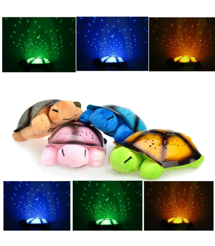 Mūzikas un gaismas nakts lampa - spilvens bruņurupucis. Nakts lampa - lielais bruņurupucis piedāvā 4 dažādas apgaismojuma krāsas un 4 melodijas! Izmantojot gaismas un zvaigznes, telpā tiek radīta burvīga atmosfēra, kas palīdz mazuļiem nokļūt sapņu pasaulē. Šī ir skaista dizaina nakts lampa bērna istabai. Tā apgaismo griestus un sienas ar zvaigznītēm dažādās krāsās.