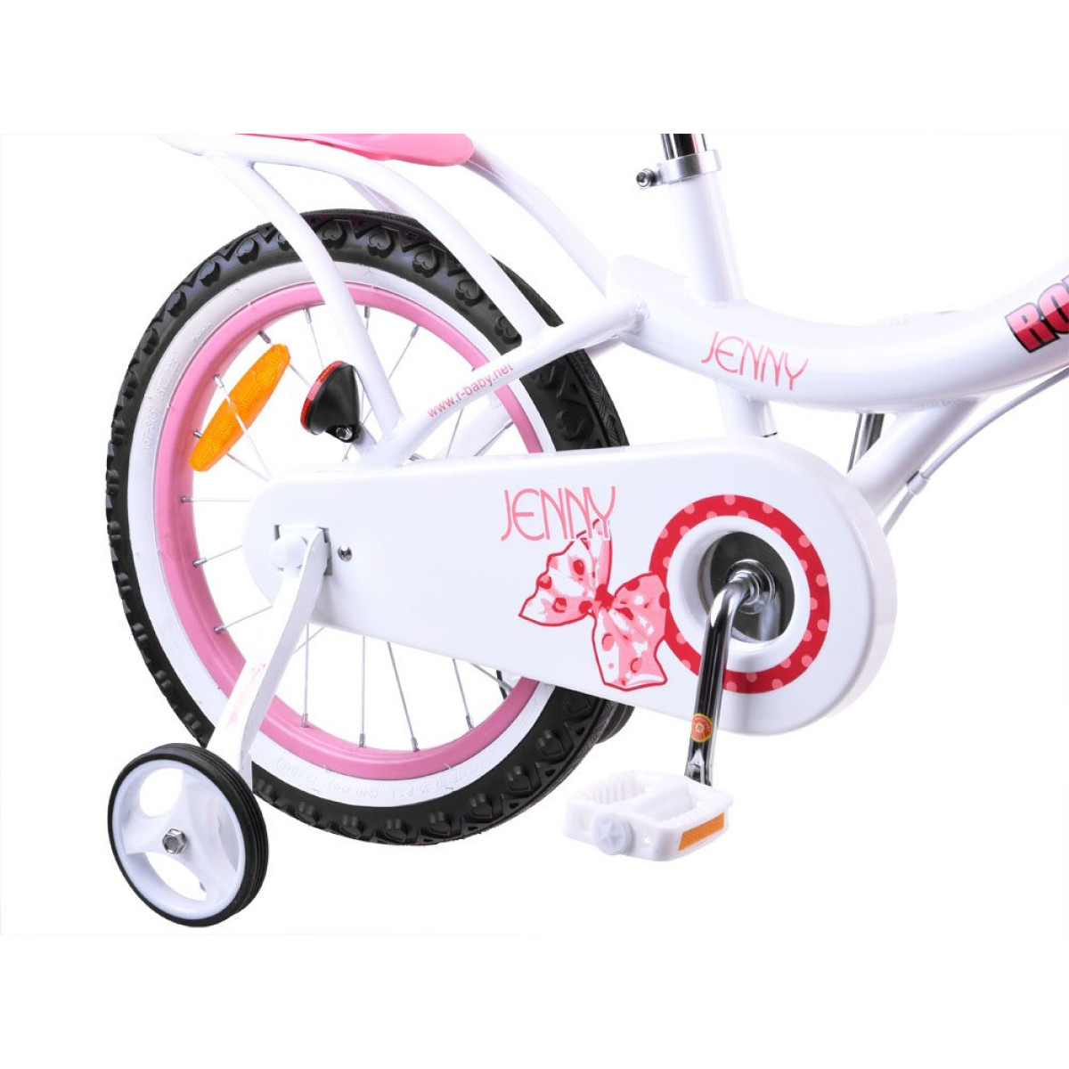 Royal Baby Jenny 16" velosipēds ir augstas kvalitātes pirmais velosipēds iesācējiem, ideāli piemērots īstam pagalma braucējam. Profesionāli veidots stūres dizains ar mīkstu aizsardzību un aksesuāriem kā lentītes, zvans, burvīgs grozs. Pilnīga ķēdes aizsardzība pasargā no savainojumiem un netīrumiem. Disku bremzes. Komfortabls sēdeklis ar vecāku turētāju. 16 collu riteņi, metāla rāmis un augstas kvalitātes riepas nodrošina ērtu un stabilu braukšanu. Sānu riteņi palīdz līdzsvara uzturēšanai, lai bērns ātrāk iemācītos patstāvīgi braukt. Saliekams stāvlaukums, kas ļauj bērnam droši novietot velosipēdu pēc braukšanas.