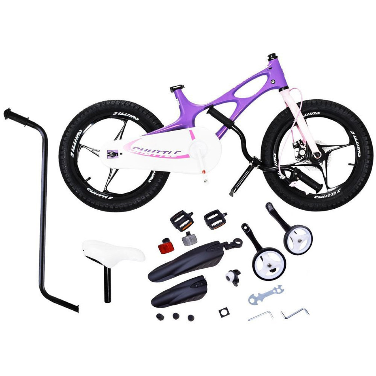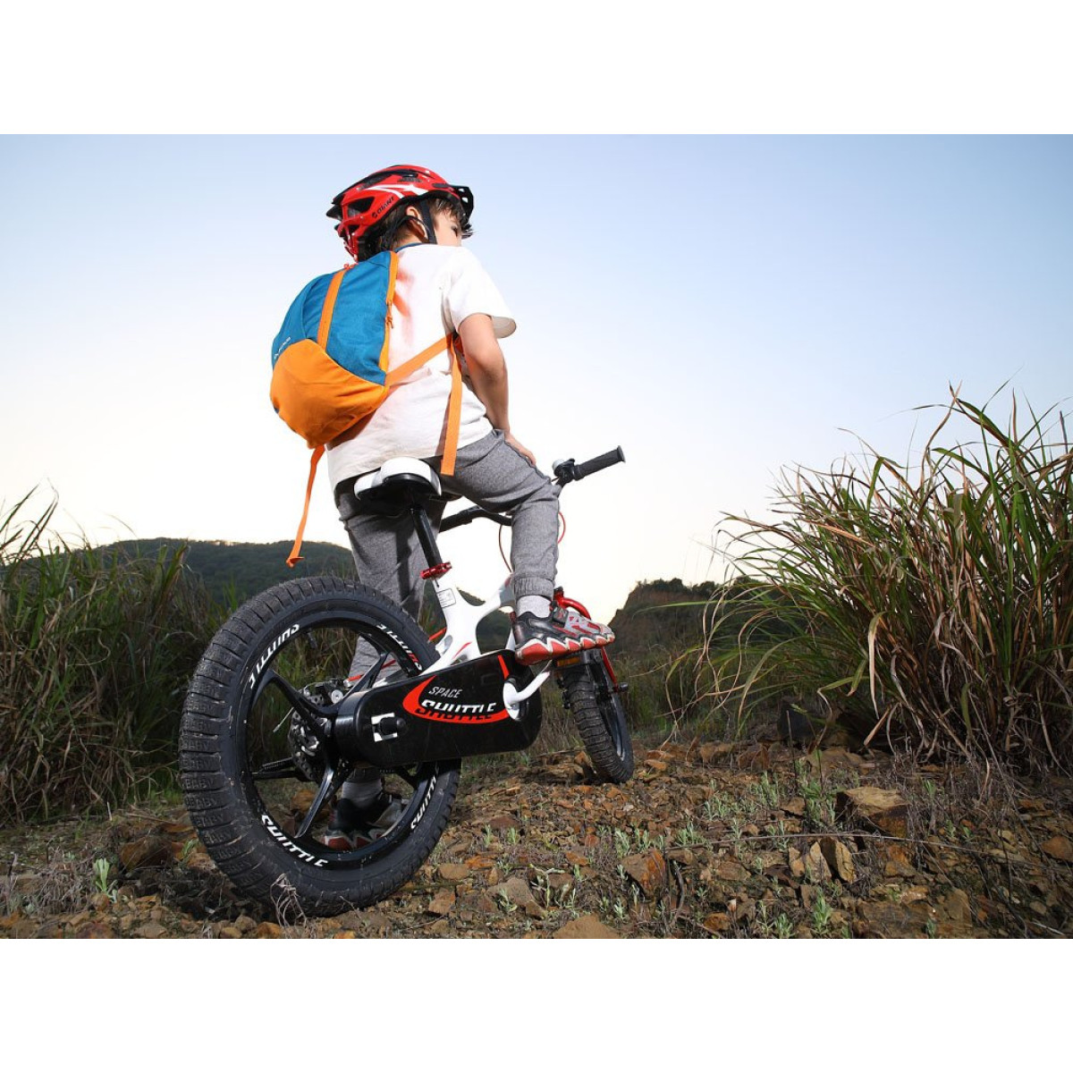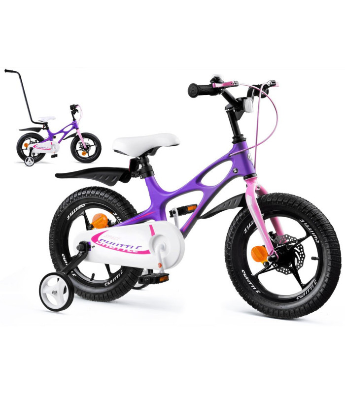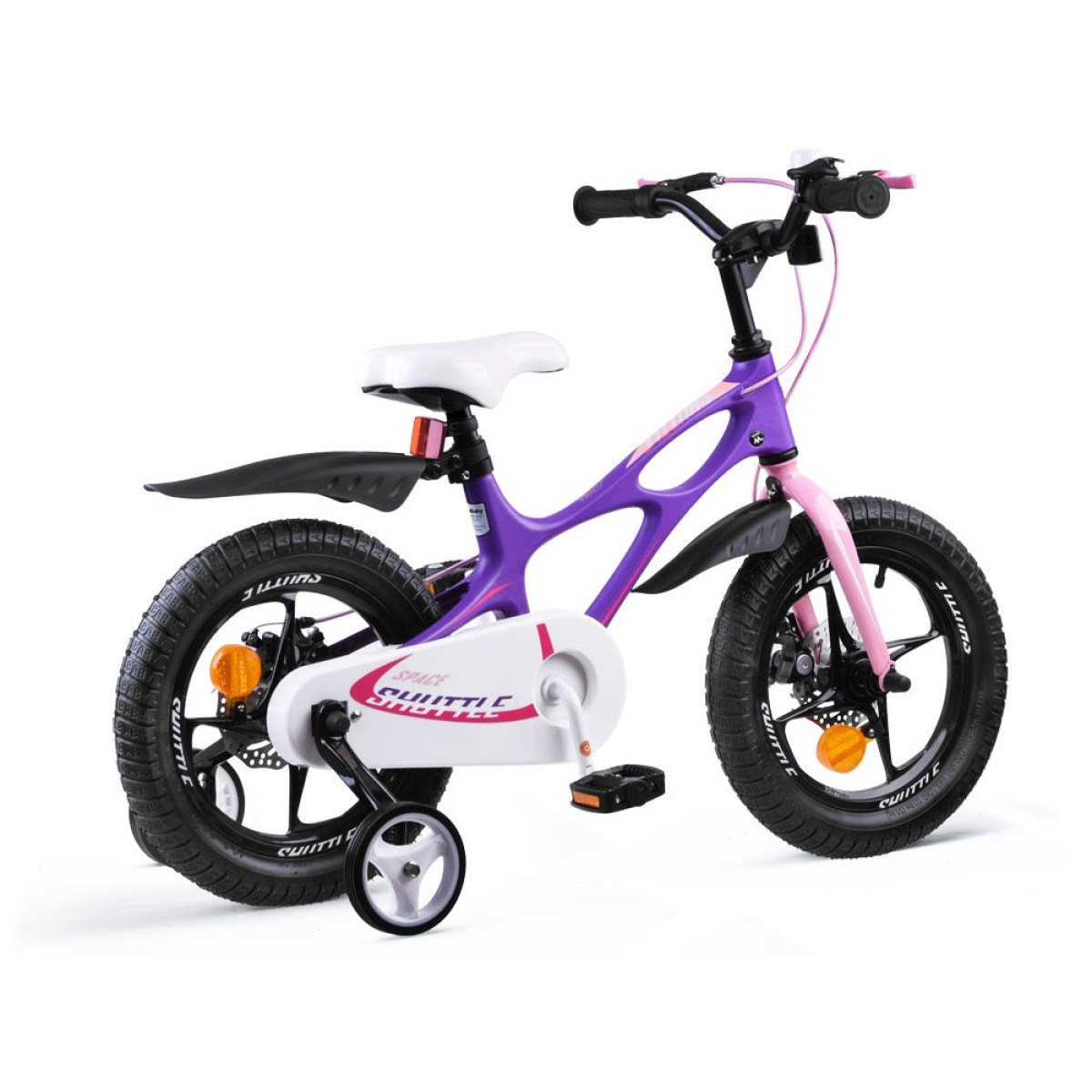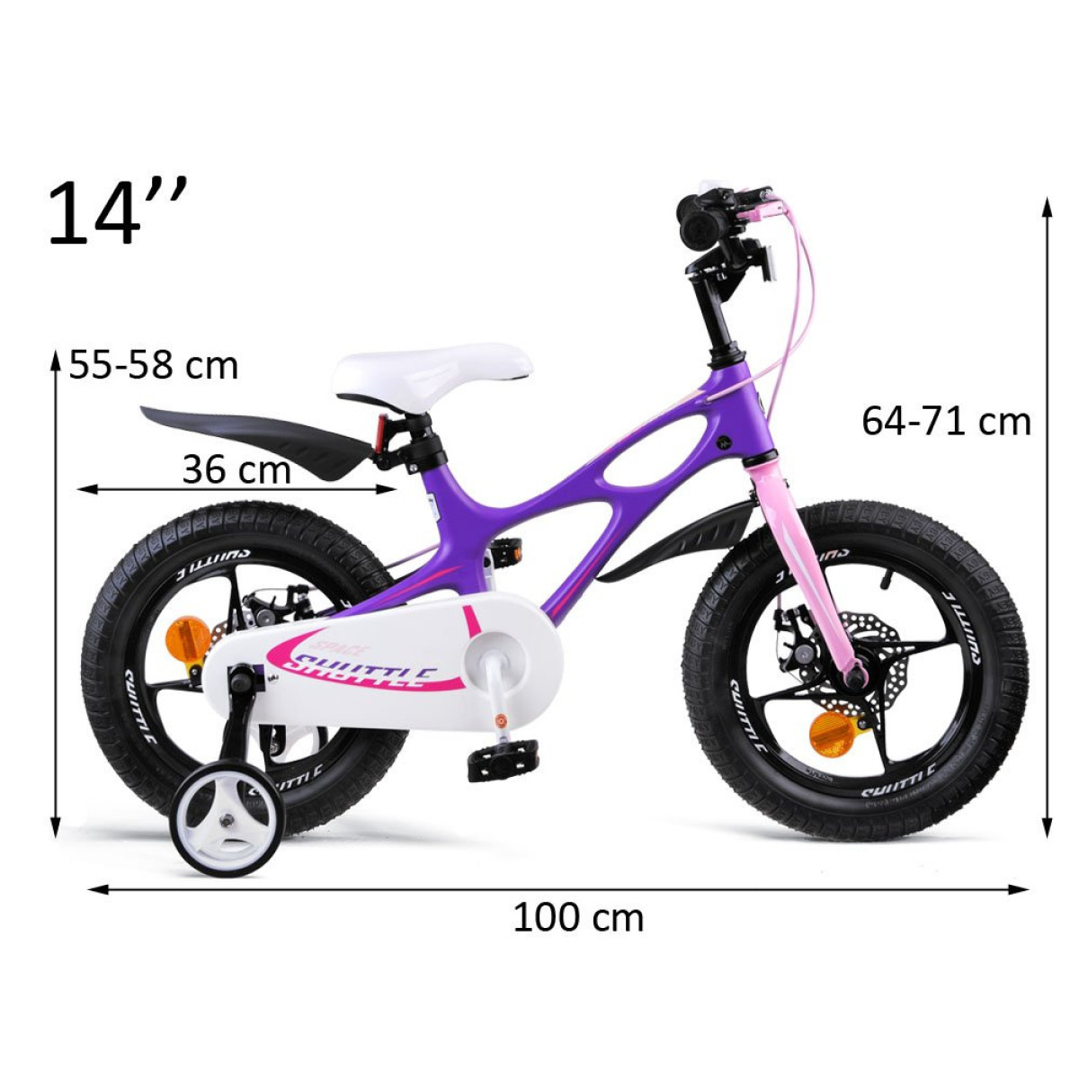 Royal Baby Space Shuttle 14" velosipēds ir augstas kvalitātes pirmais velosipēds divriteņu entuziastiem, ideāli piemērots īstiem pagalma braucējiem. Magnija, viegla rāmis ar izliekto virsmu un gludām līnijām, kā arī regulējams stūres rats profesionāli profilēts ar drošiem gumijas rokturiem, noslēgtu regulācijas aizsargu, zvaniņu un atstarotāju. Komfortabls sēdeklis, 14 collu riteņi ar augstas kvalitātes riepām, dubultā droša bremžu sistēma ar dubultām disku bremzēm nodrošina komfortablu un stabilu braukšanu. Sānu riteņi + piestiprināms stienis palīdzēs uzturēt līdzsvaru sākumā, lai bērns ātrāk iemācītos patstāvīgi braukt. Pilna ķēdes aizsardzība pasargā no ievainojumiem un netīrumiem. Augstas kvalitātes komponenti, kas nerada problēmas lietošanā. Krāsojums un grafika, kas iepatiksies gan īpašniekam, gan draugiem. Velosipēds ir lieliski izstrādāts, attālumi starp stūri, sēdekli un pedāļiem ir proporcionāli saglabāti, nodrošinot plūstošu un ērtu braukšanu.