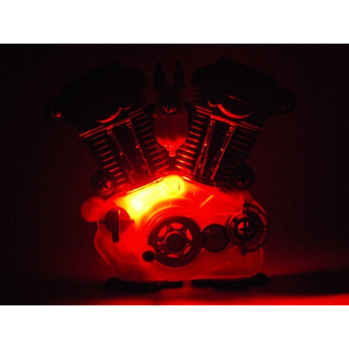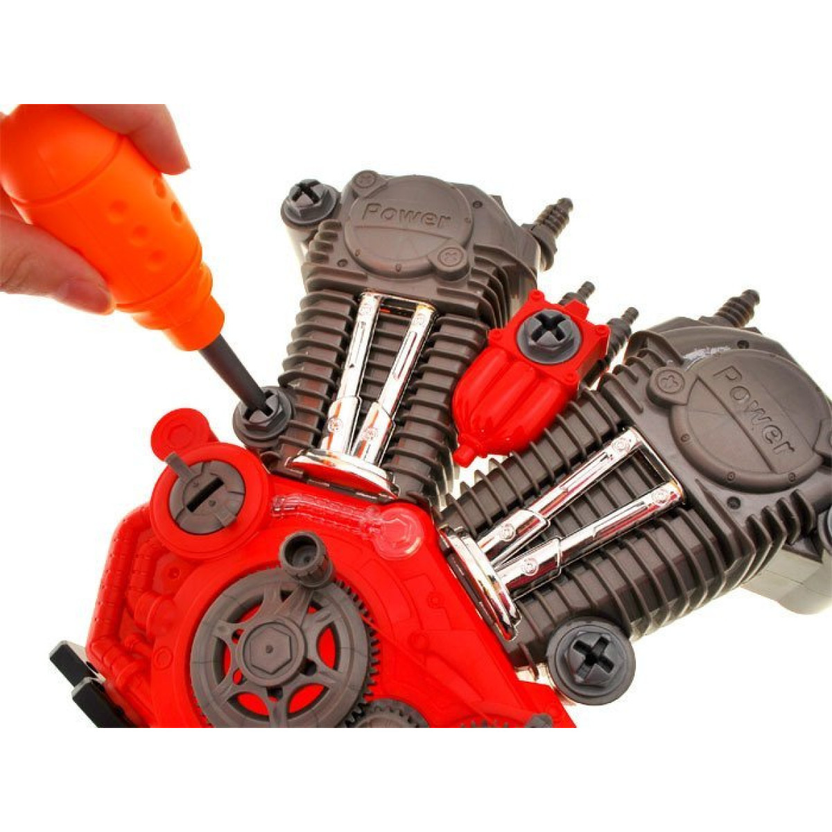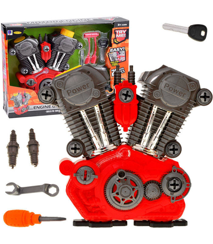 Rotaļlieta dzinēja veidā ar skaņas efektiem, iespēju skrūvēt un pārbaudīt, kā cilindri darbojas.