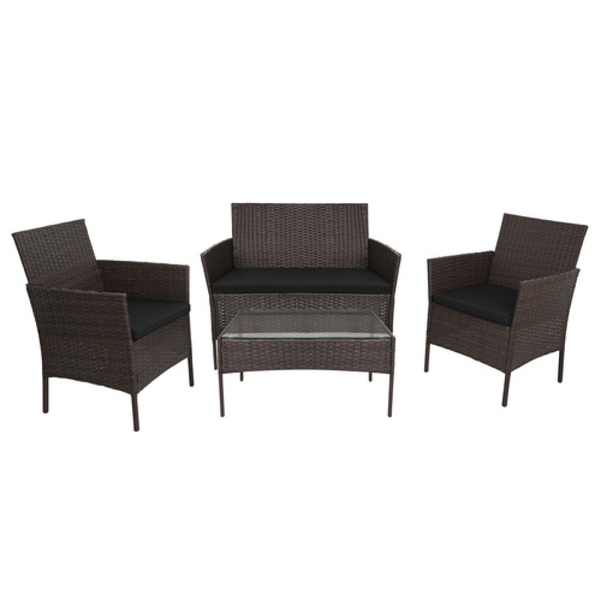 Dārza mēbeļu komplekts Gardlov, kas izgatavots no ratanas, ietver divus krēslus, dīvānu un galdu ar stikla virsmu un spilveniem.