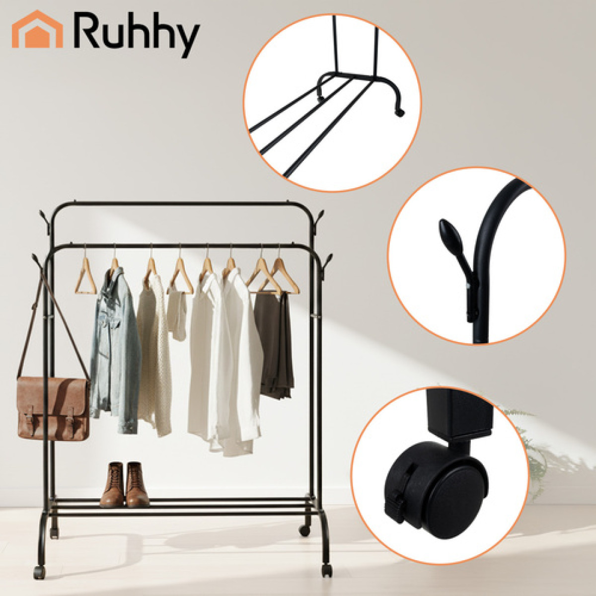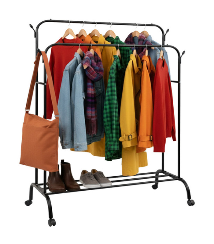 Vai esi noguris no nekārtības un rīta haosa? Apģērbu pakaramais uz riteņiem RUHHY - pakaramais, kas beidzot sakārtos tavu telpu, divkāršs ar plauktu un āķiem.
