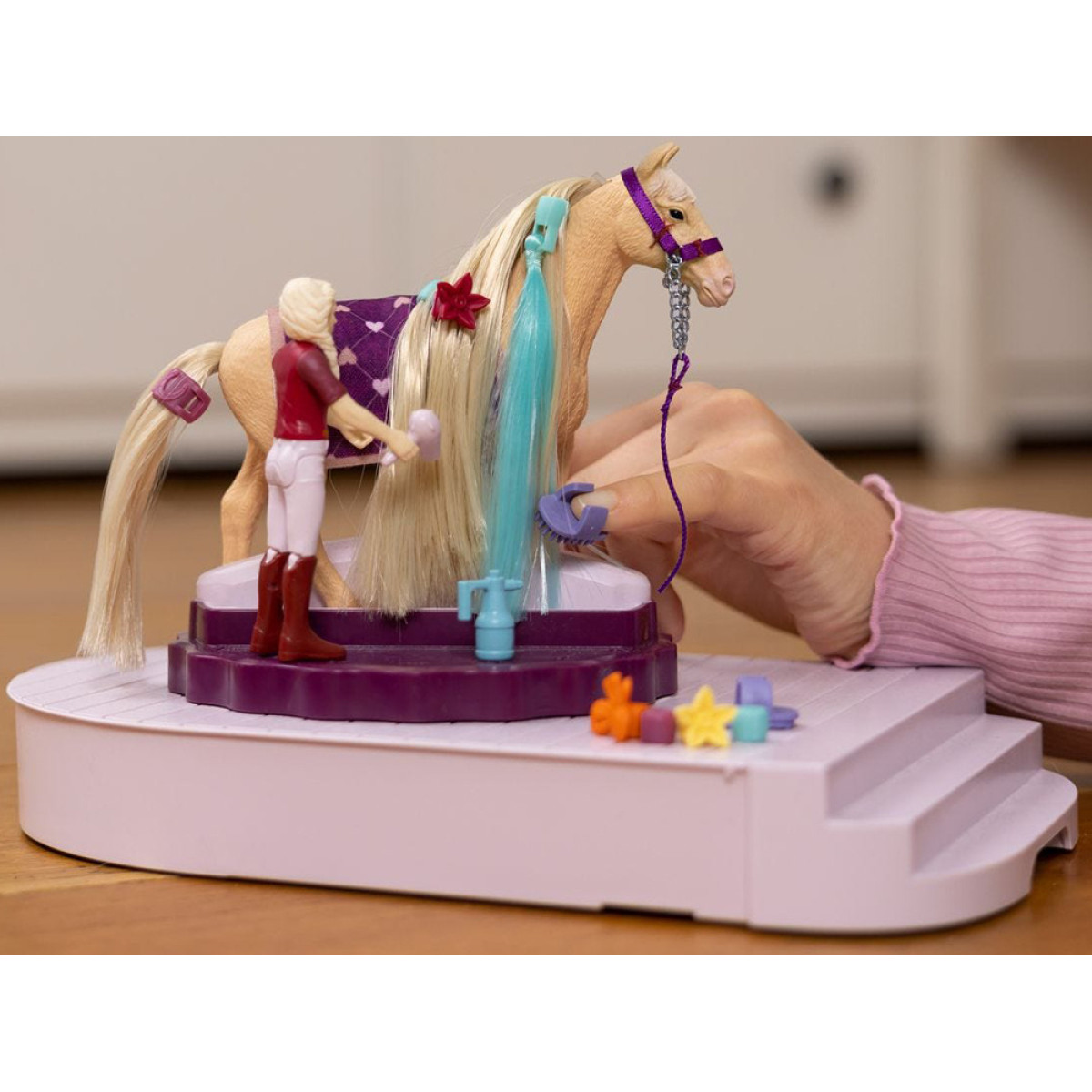 Tas piedāvā daudz spēlēšanās iespēju! Lellei ir kustīgas ekstremitātes, kas ļauj veikt dažādas darbības. Zirga krēpes un asti var ķemmēt un stilizēt pēc savām vēlmēm. Daudz aksesuāru ļauj radīt dažādas unikālas stilizācijas, lai zirgs vienmēr izskatītos neticami! Rotējošā platforma atvieglo stilizāciju un rezultātu demonstrēšanu. Ērta atvilktne aksesuāriem lieliski piemērota to glabāšanai un kārtības uzturēšanai.