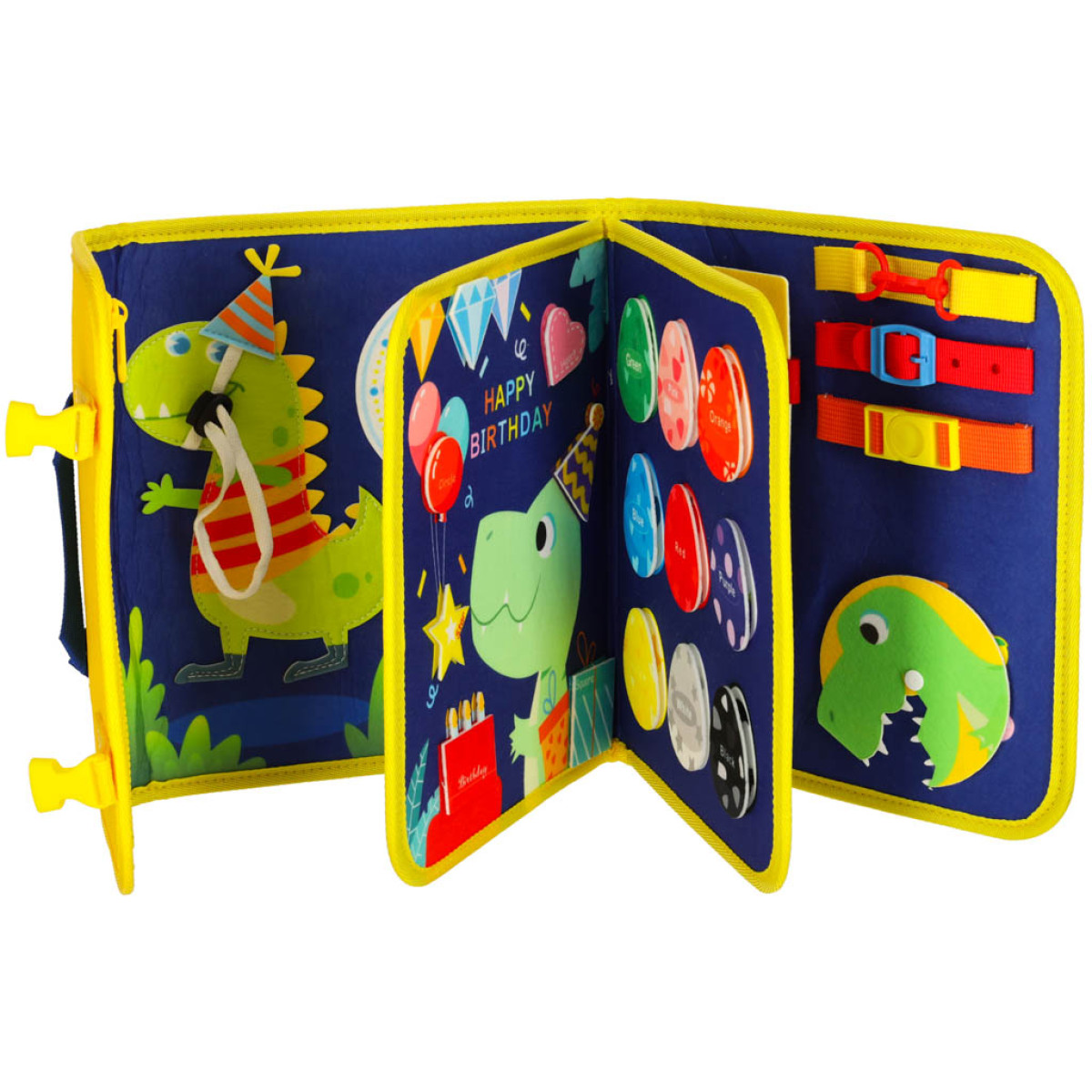 Sensorā manipulācijas dēlis ar dinozauru motīvu satur elementus, kas noderēs svešvalodas, formu, krāsu un ciparu mācībām. Daļa dēļa elementu ir angļu valodā, kas ļauj bērnam apgūt un nostiprināt vārdu krājumu.