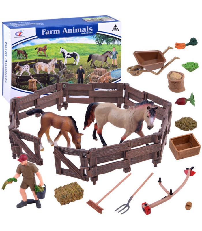 Komplekts ietver visus nepieciešamos elementus, lai izveidotu reālu fermu, kur katrs dzīvnieks būs savā vietā un aprūpētājs - ar nepieciešamiem darba rīkiem. Komplektā ietilpst: