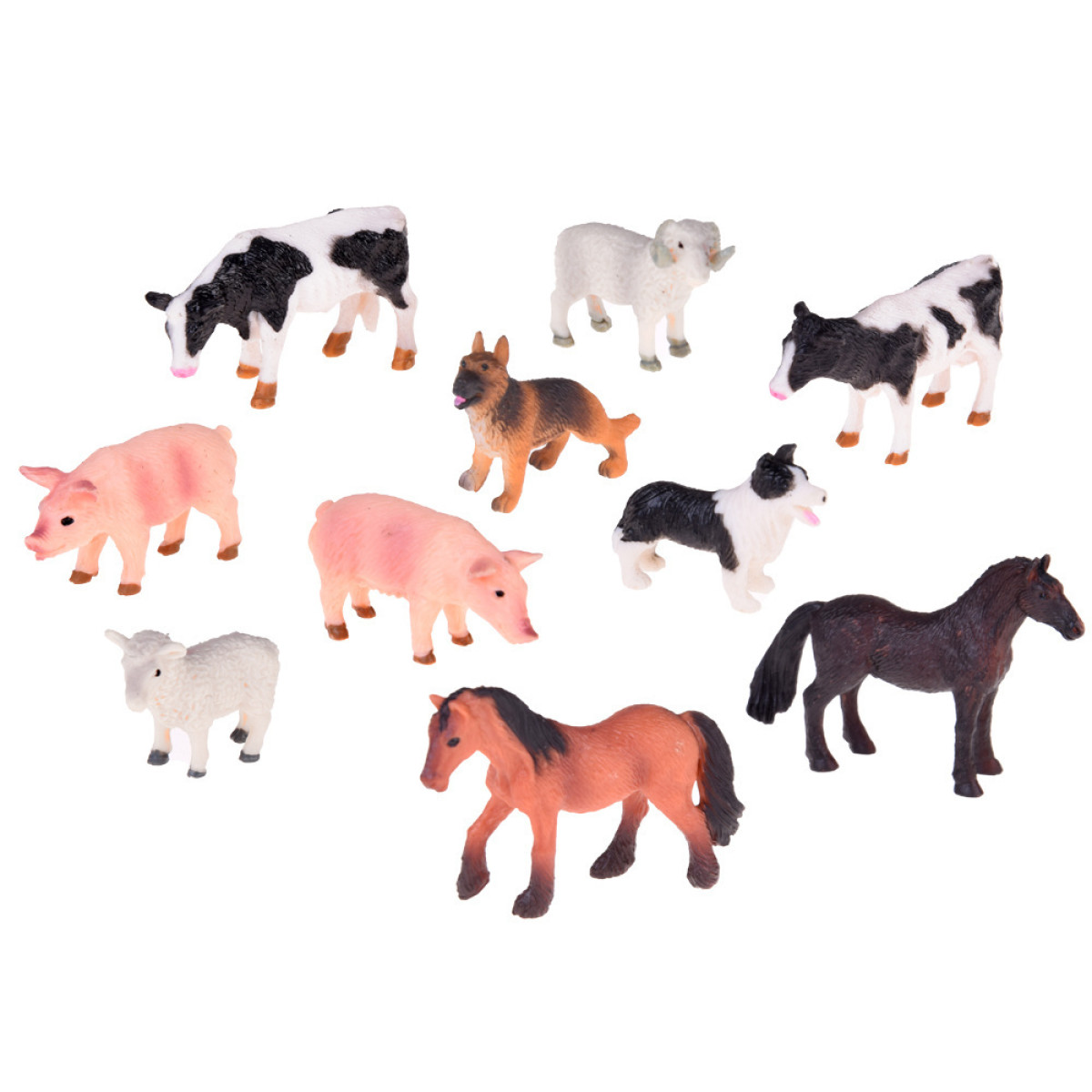 - dzīvnieku figūras: 2 zirgi, 2 govis, 2 cūkas, 2 aitas, 2 suņi