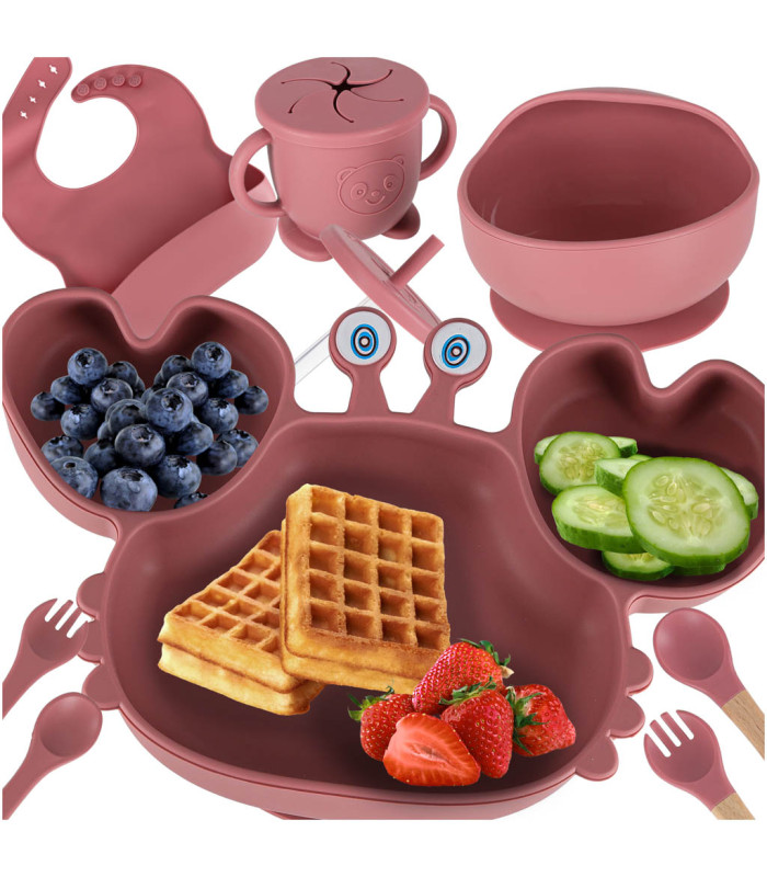 Silikona trauku komplekts bērniem Krabis, 9 elementi, tumši rozā