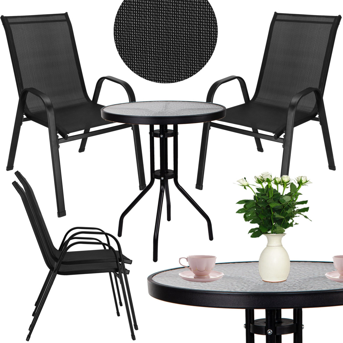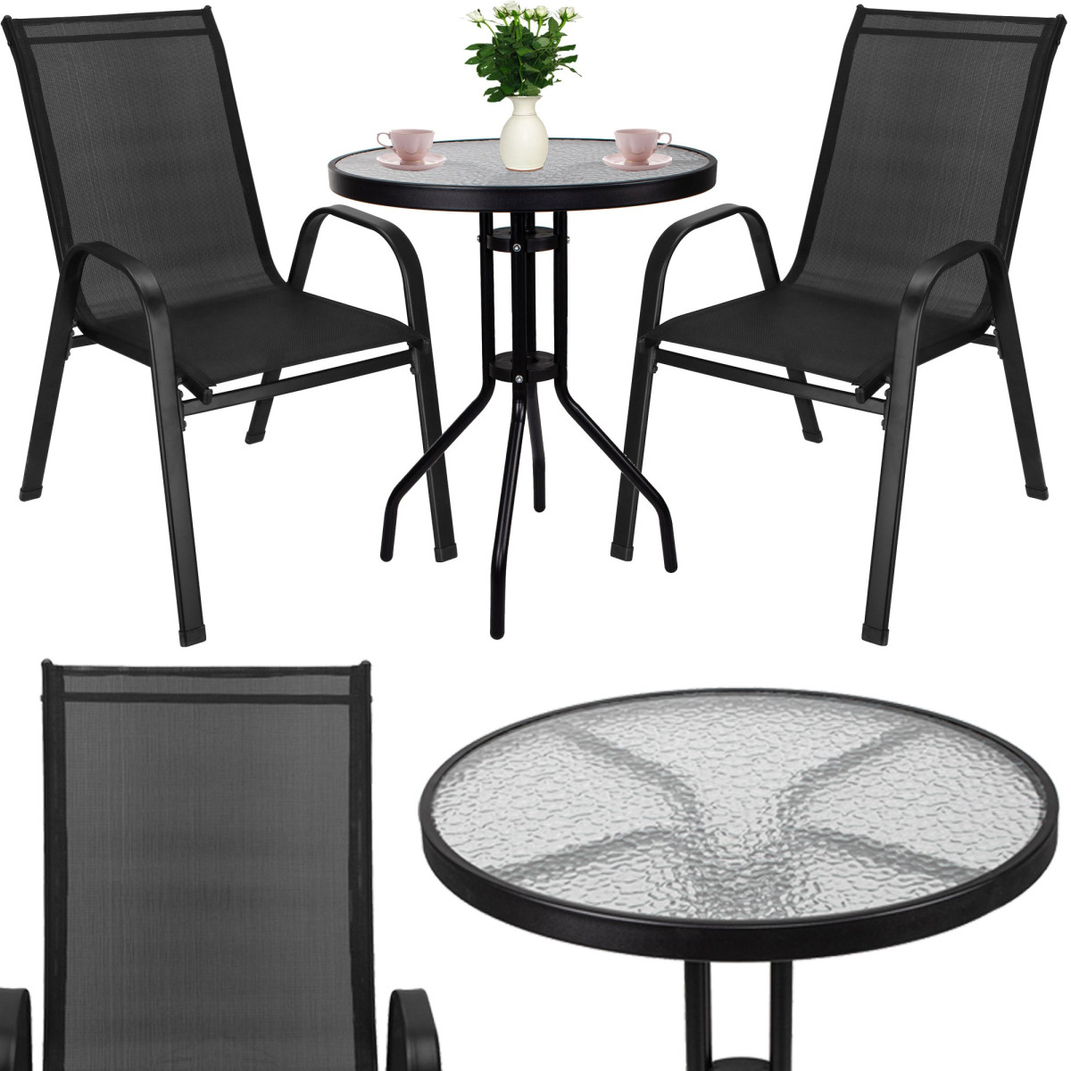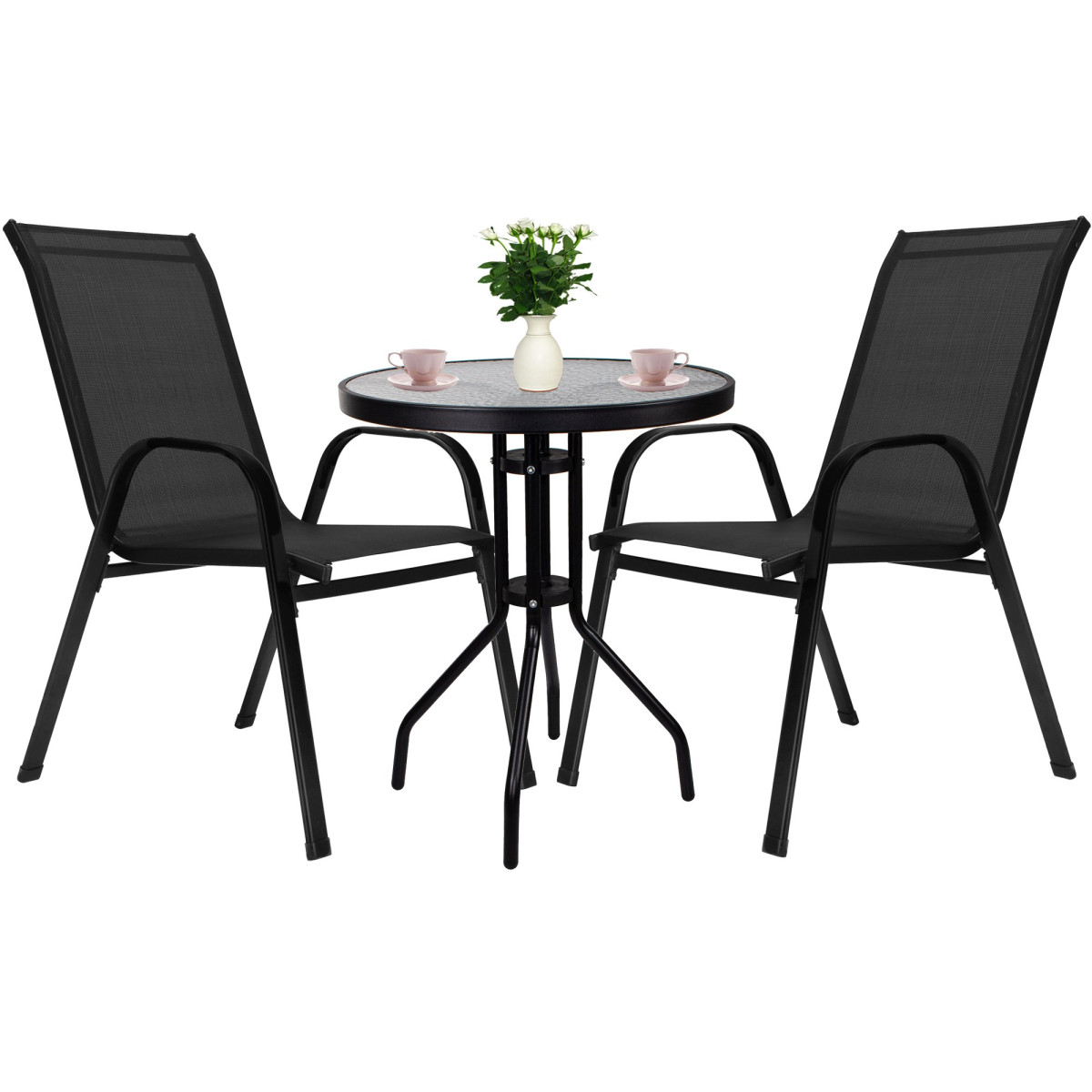 Zīmols: Springos® Krāsa: melna Materiāls: metāls/pulverkrāsots tērauds, rūdīts stikls 5 mm, textilene Komplektā: 2x krēsli, 1x kafijas galds Produkts paredzēts pašmontāžai – instrukcija iekļauta Krēsli: 92 x 53 x 72 cm Galds: augstums 70 cm x diametrs 60 cm Maksimālā slodze krēslam: 120 kg Maksimālā slodze galdam: 50 kg Krēsli: Kopējais augstums: 92 cm Kopējais platums: 53 cm Kopējais dziļums: 72 cm Atzveltnes platums: 44 cm Atzveltnes augstums: 55 cm Sēdekļa dziļums: 42 cm Sēdekļa platums: 44 cm Roku balsta garums: apm. 30 cm Augstums no zemes līdz sēdeklim: 42 cm Augstums no zemes līdz roku balstam: 58 cm Roku balsta/kāju profils: 4 x 1.5 cm Attālums starp kājām (uz grīdas): platums – 50 cm; dziļums – 56 cm Galds: Galda virsmas diametrs: 60 cm Kopējais augstums: 70 cm Virsmas rāmja biezums: 3 cm Stikla biezums: apm. 5 mm Konstrukcijas caurules diametrs: apm. 2.5 cm Attālums starp kājām (uz grīdas): platums – 36 cm; dziļums – 52 cm