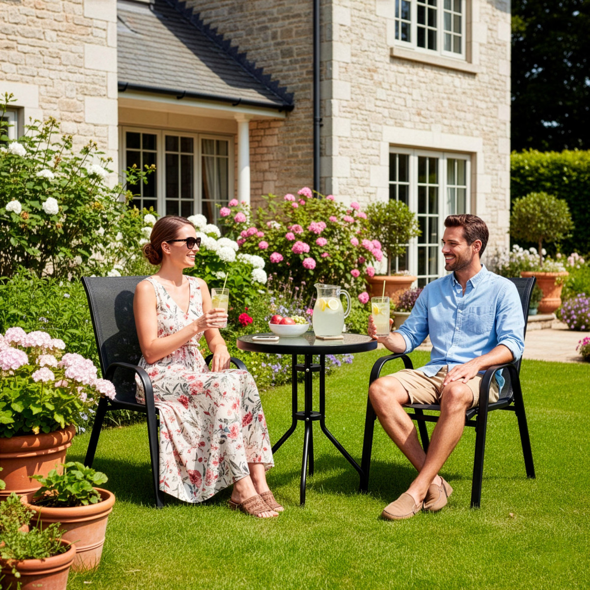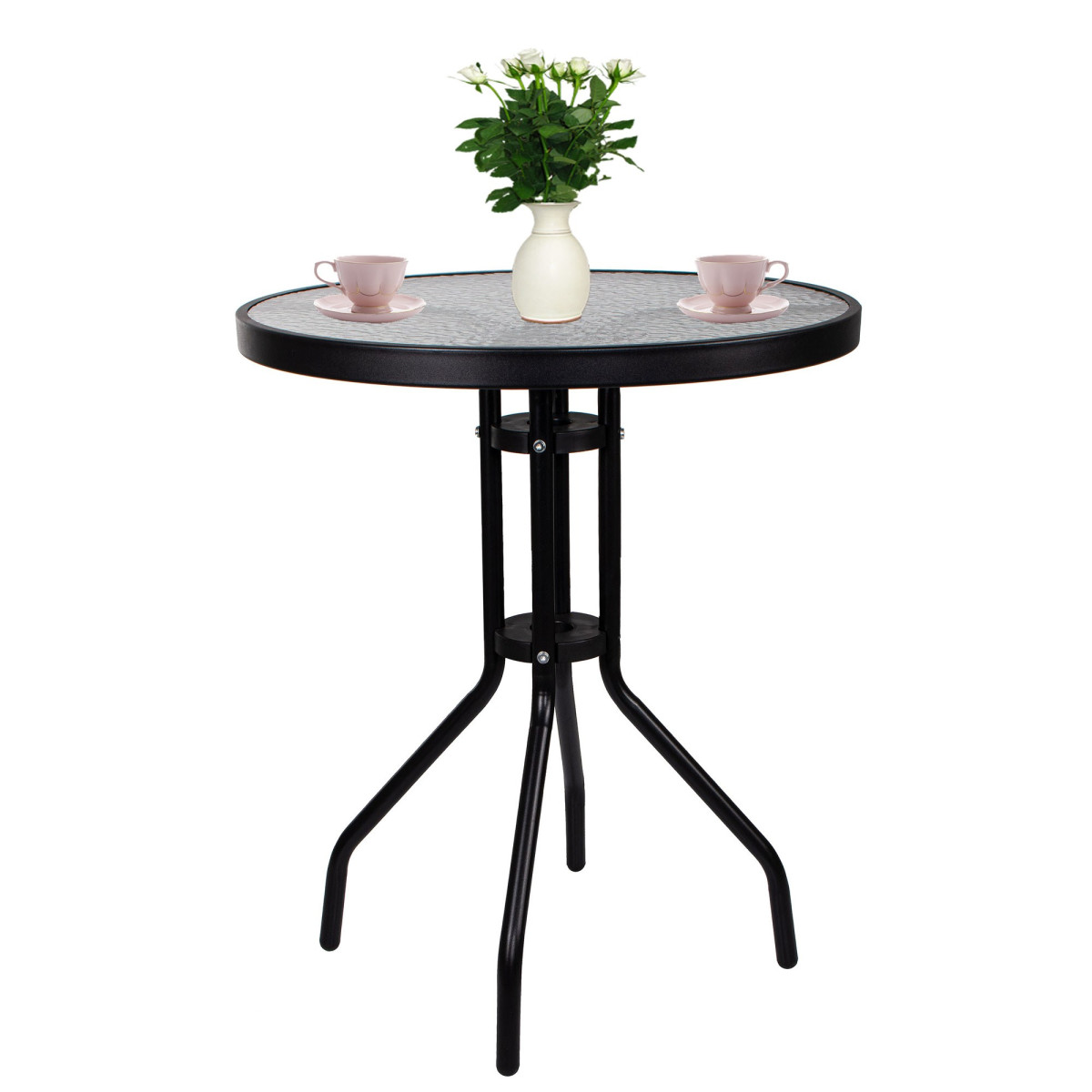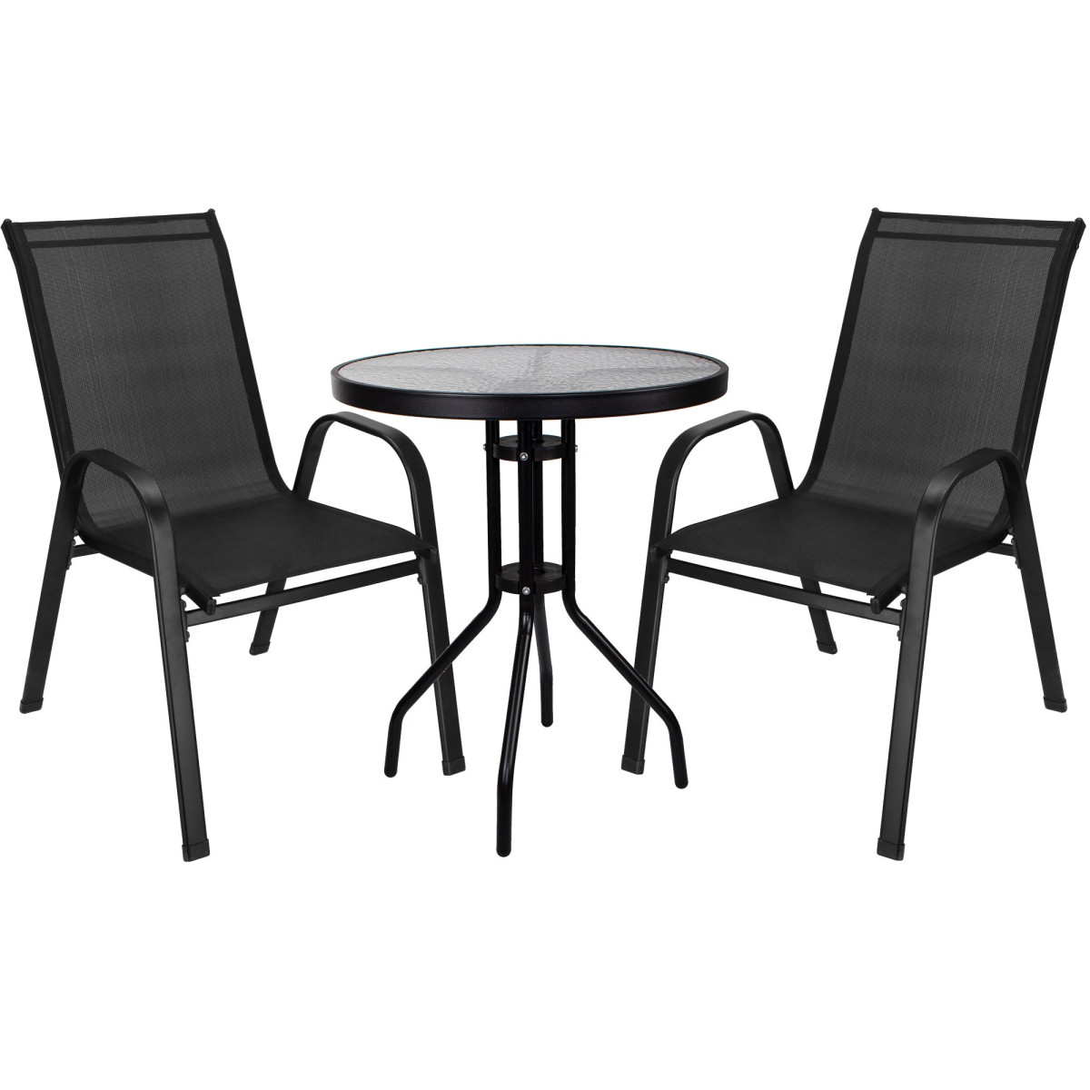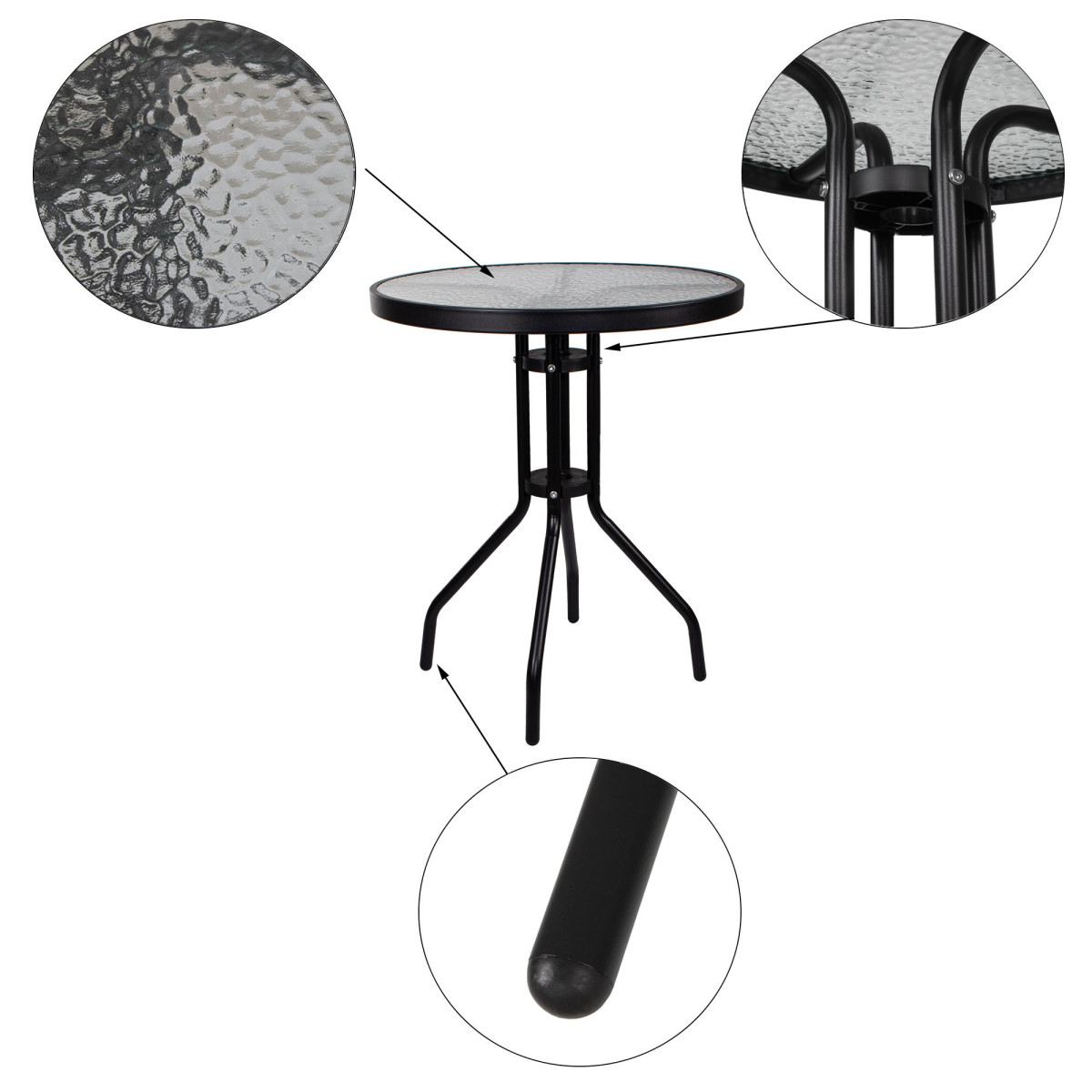 Zīmols: Springos® Krāsa: melna Materiāls: metāls/pulverkrāsots tērauds, rūdīts stikls 5 mm, textilene Komplektā: 2x krēsli, 1x kafijas galds Produkts paredzēts pašmontāžai – instrukcija iekļauta Krēsli: 92 x 53 x 72 cm Galds: augstums 70 cm x diametrs 60 cm Maksimālā slodze krēslam: 120 kg Maksimālā slodze galdam: 50 kg Krēsli: Kopējais augstums: 92 cm Kopējais platums: 53 cm Kopējais dziļums: 72 cm Atzveltnes platums: 44 cm Atzveltnes augstums: 55 cm Sēdekļa dziļums: 42 cm Sēdekļa platums: 44 cm Roku balsta garums: apm. 30 cm Augstums no zemes līdz sēdeklim: 42 cm Augstums no zemes līdz roku balstam: 58 cm Roku balsta/kāju profils: 4 x 1.5 cm Attālums starp kājām (uz grīdas): platums – 50 cm; dziļums – 56 cm Galds: Galda virsmas diametrs: 60 cm Kopējais augstums: 70 cm Virsmas rāmja biezums: 3 cm Stikla biezums: apm. 5 mm Konstrukcijas caurules diametrs: apm. 2.5 cm Attālums starp kājām (uz grīdas): platums – 36 cm; dziļums – 52 cm