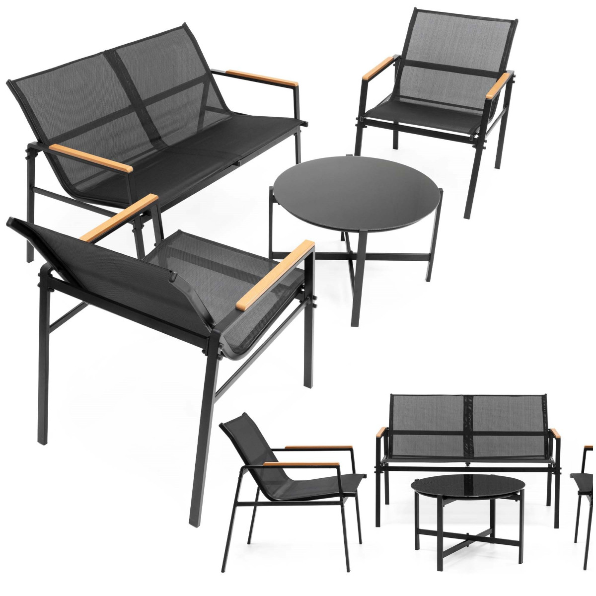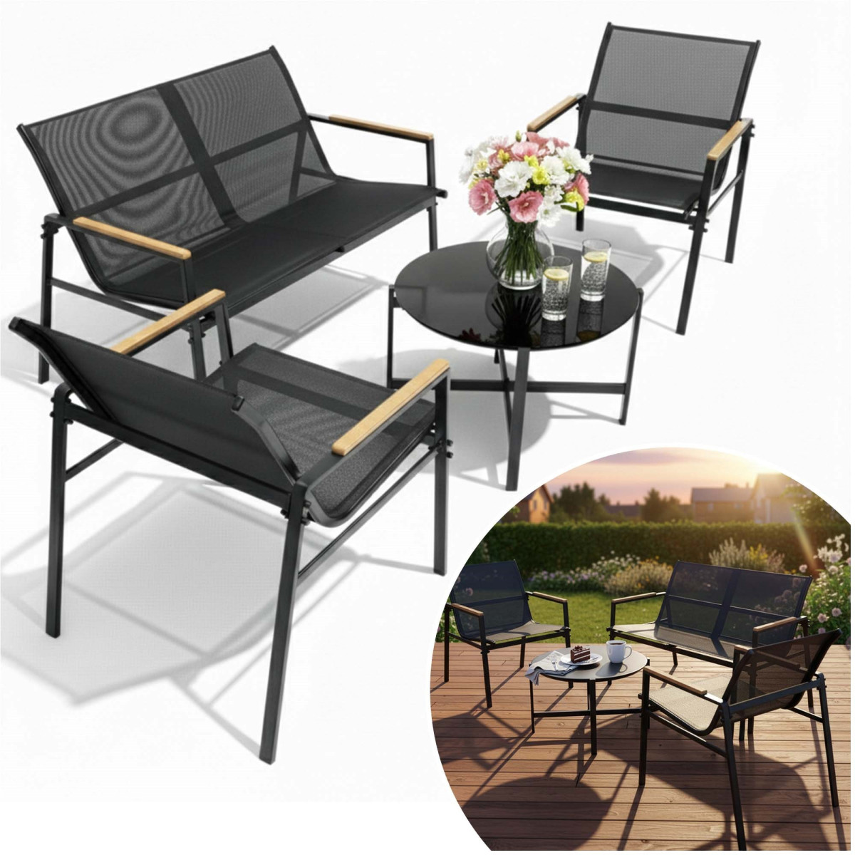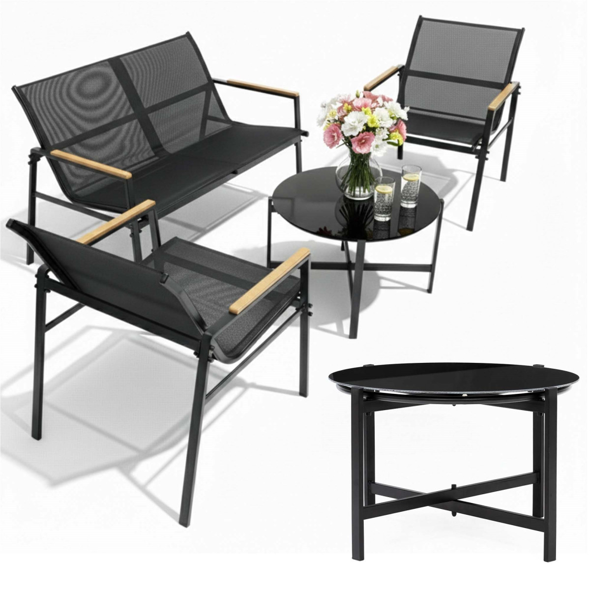 dārza mēbeļu komplekts gf0120 ir praktiska un eleganta izvēle atpūtai dārzā, terasē vai balkonā. komplektā ir 4 elementi: kafijas galds ar melnu rūdītu stiklu, 2 krēsli un dīvāns. melnā krāsa un koka imitācijas detaļas piešķir komplektam modernu un dabisku izskatu.