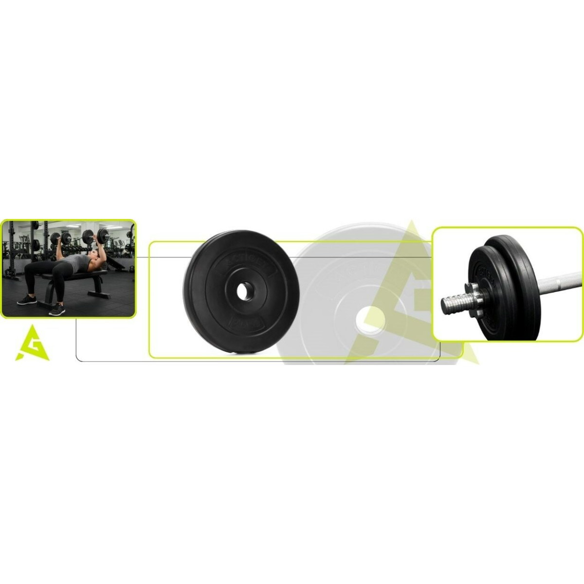 Zīmols: Actiget® Universālā sērija Materiāls: ārējais pārklājums no PP, pildījums – cements Krāsa: melna Svars: 2,5 kg Izmēri: Kopējais diametrs: 21,5 cm Biezums: 3,7 cm Iekšējais diametrs: 3,1 cm Papildu informācija: Uz produkta ir Actiget® logotips